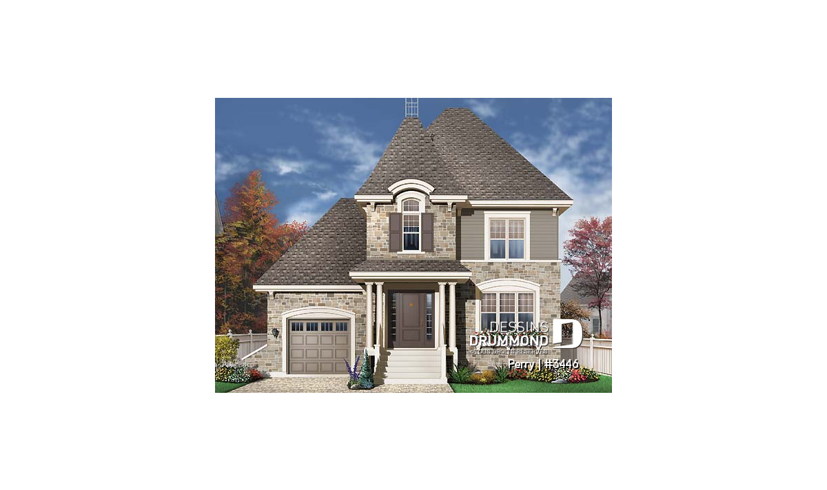 Plan de maison style manoir, pour terrain étroit, 3 chambres, garage et coin déjeuner