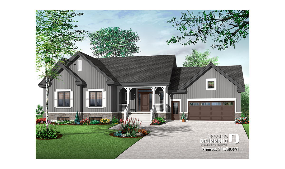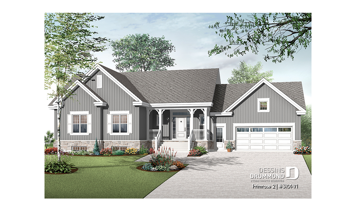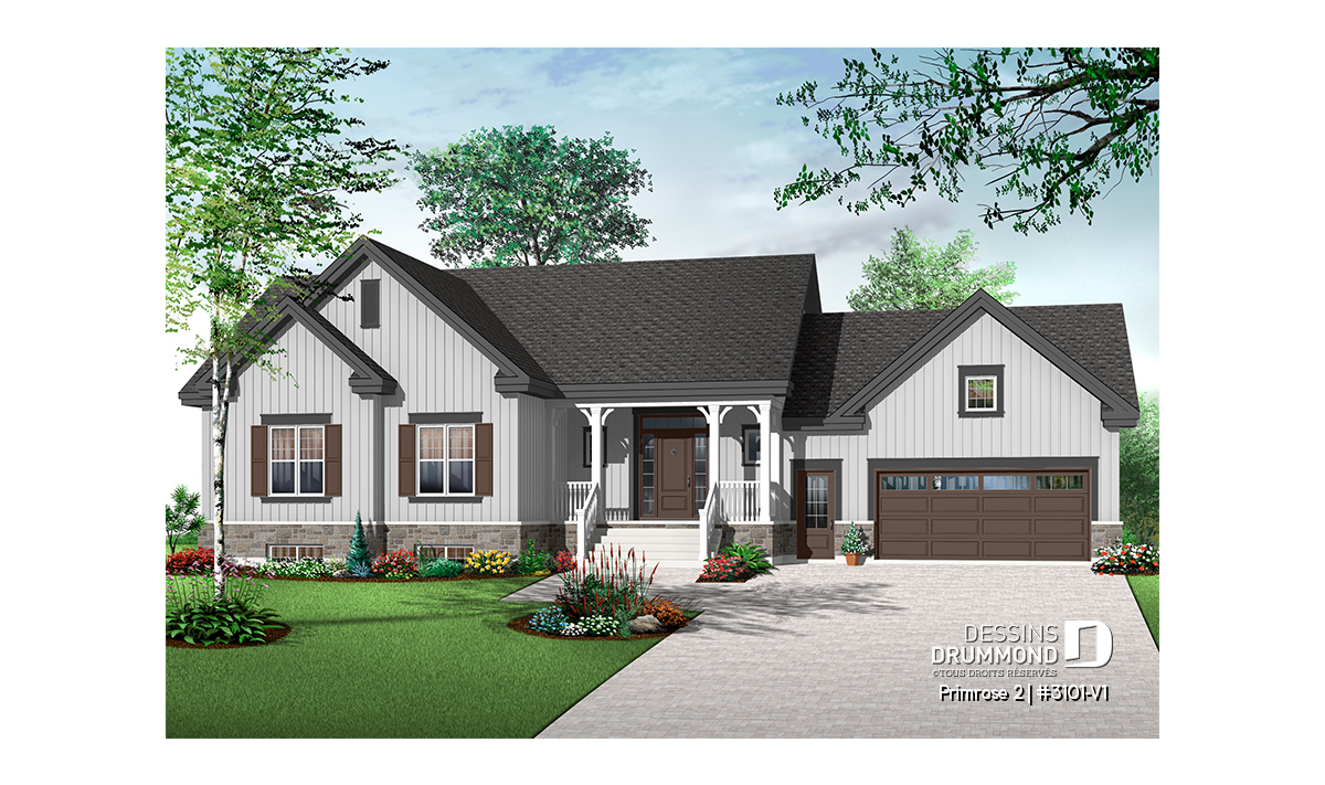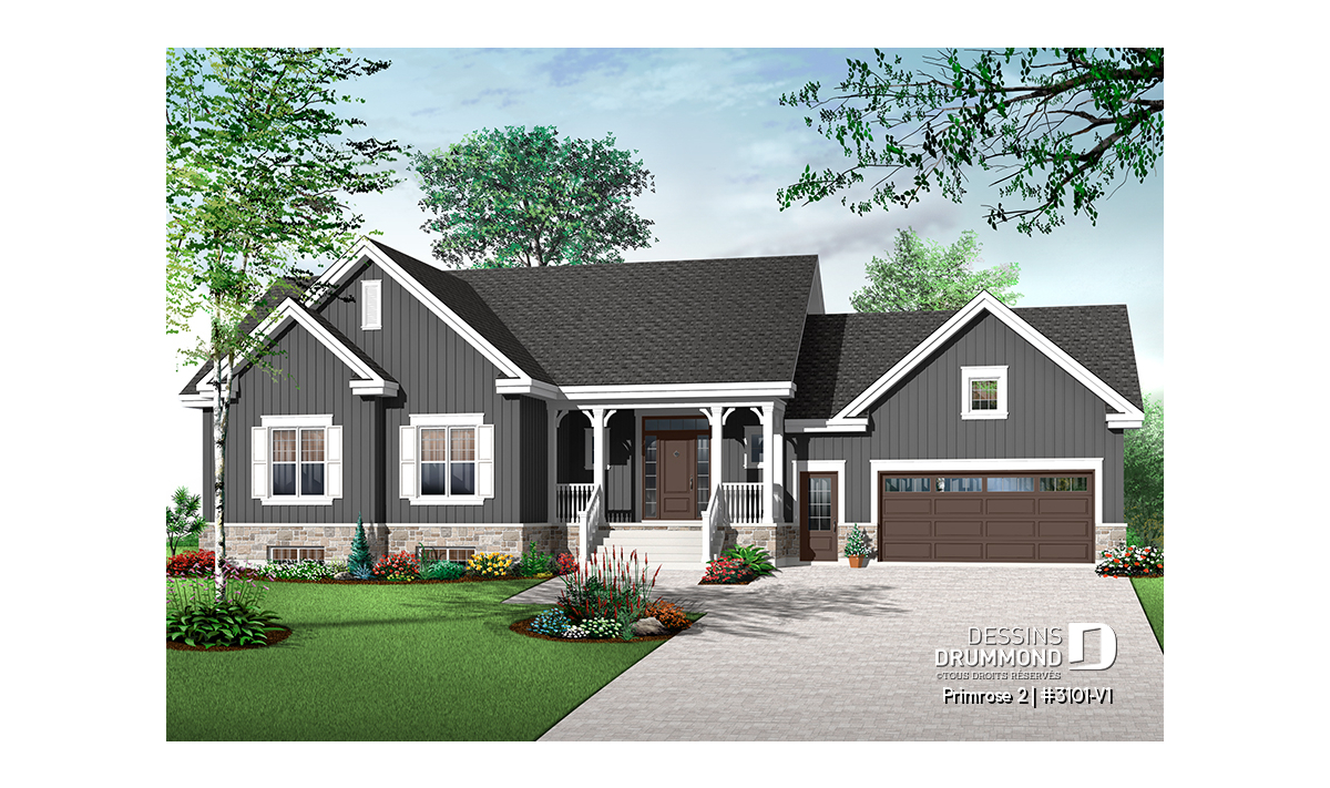 Vous êtes à la recherche d’un plan de plain-pied proposant de 3 à 6 chambres à coucher et plein d’utilités ? Jetez donc un œil à celui-ci et appréciez-en tous les attributs comme cette belle galerie couverte à l’avant ou ce garage double avec escalier vers le sous-sol ou même cet intérieur remarquablement aménagé. D’ailleurs, entrons sans plus tarder !