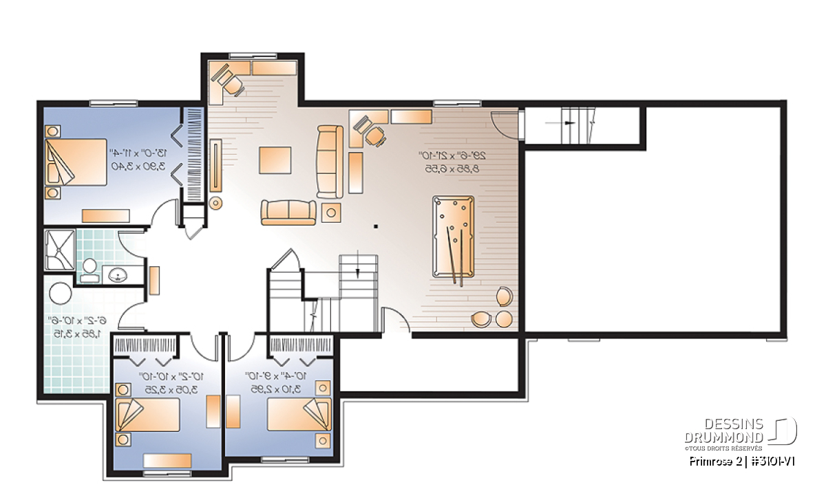 Bien entendu, pour annoncer 6 chambres, on a aménagé le sous-sol avec des fenêtres suffisamment adéquates et quel aménagement ! Pour celui-ci, le plan suggère donc trois belles chambres, une vaste salle familiale à double vocation dont l’espace pour une table de billard, une salle de douche, une chambre froide et un rangement comme il se doit et pour une maison de plain-pied fort logeable et fort bien aménagée.