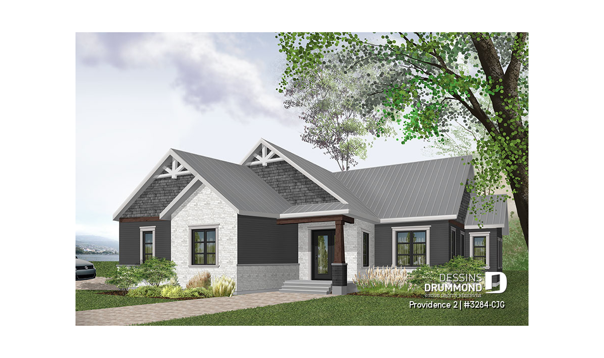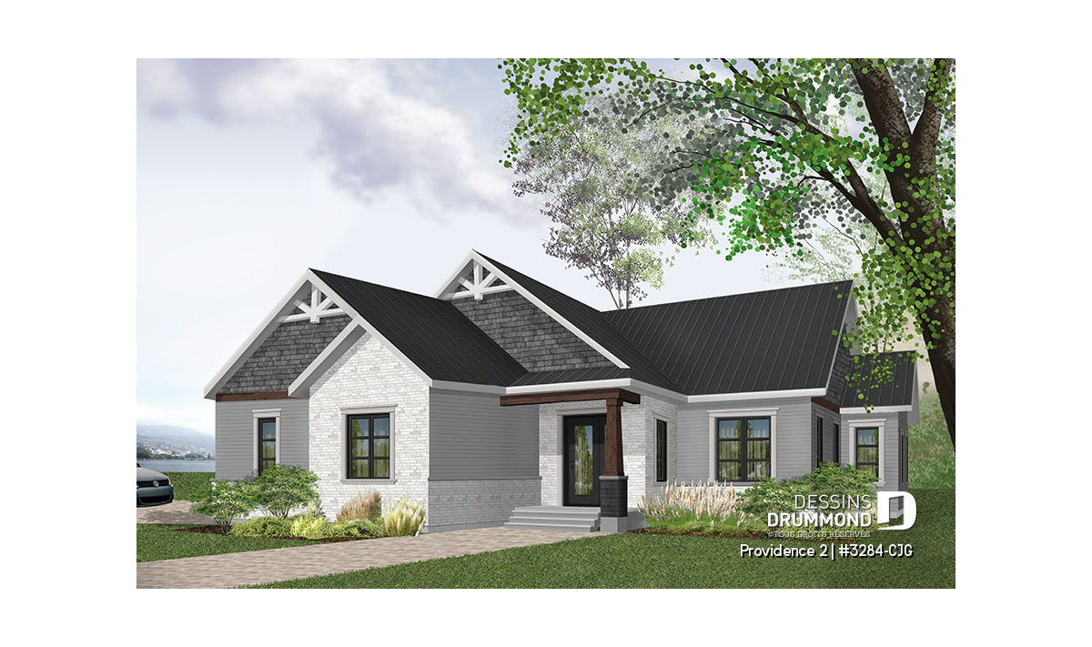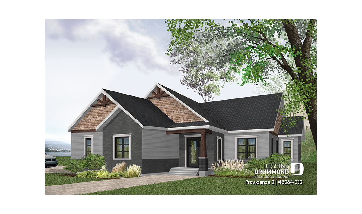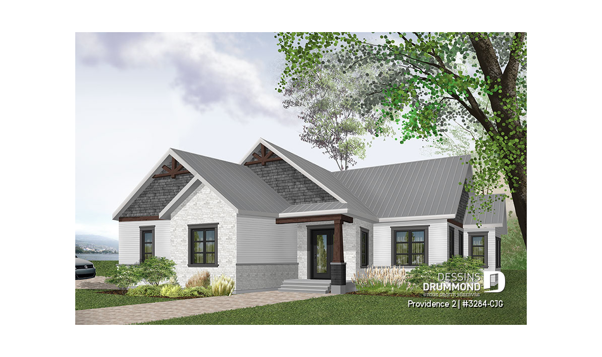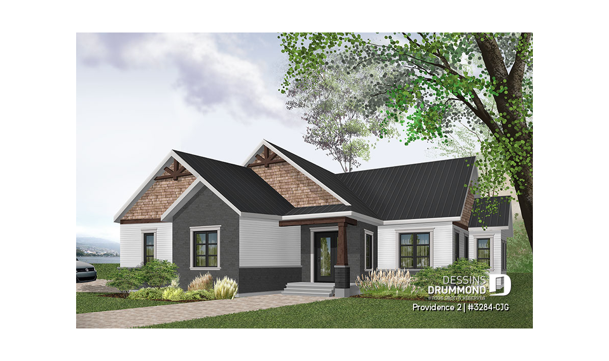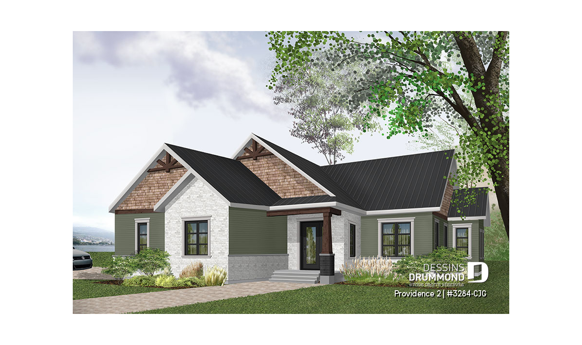 Se voulant répondre à une grande demande pour des modèles exposant des poutres de bois décoratives en façade, nous vous proposons ici une version dérivée du plan de base de cette nouvelle collection de plans de maison de style Craftsman, ou champêtre rustique (ou nordique), offrant 3 chambres. Cette variante propose donc un garage double avec entrée latérale, idéal pour terrain en coin de rue, ainsi qu'un accès direct à la maison du garage.