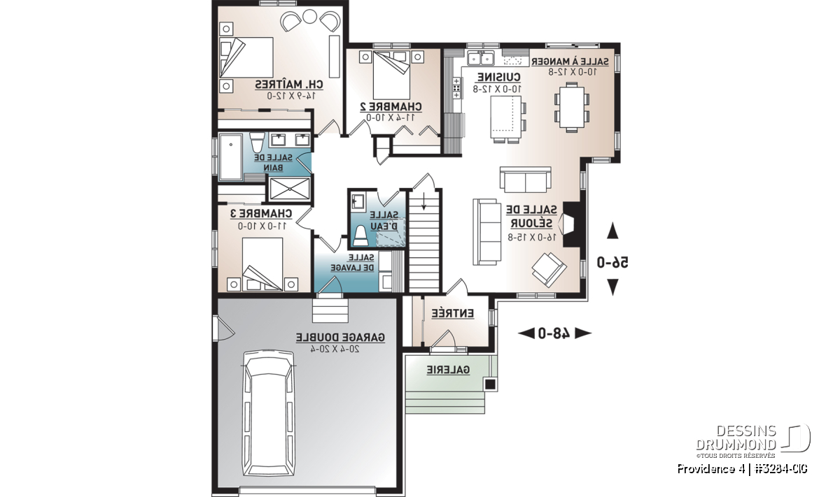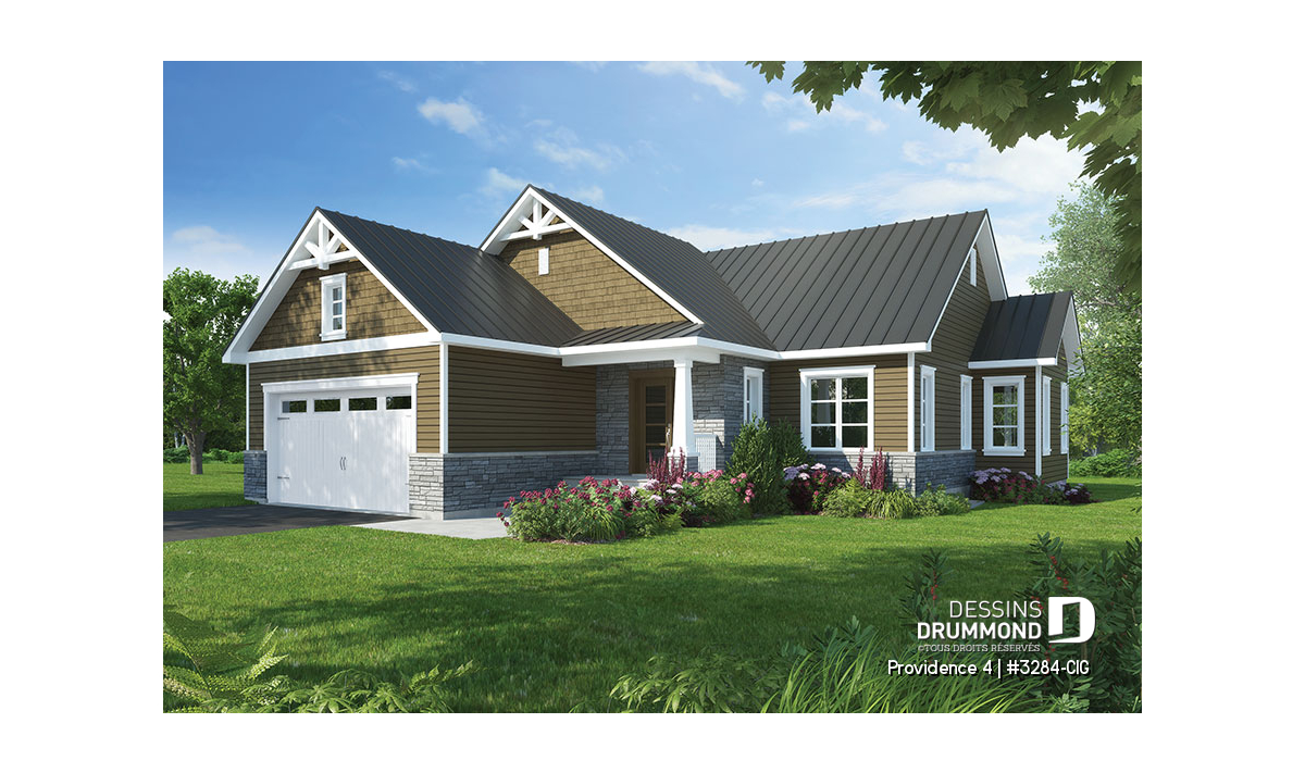 Pour ce modèle-ci, nous vous proposons une version maison pour terrain étroit avec garage double frontal, mais notez que d’autres versions sans garage et avec garage latéral sont également disponibles. De plus, ce plan inclut un sous-sol aménageable. Il est possible d’effectuer des modifications au plancher de ce plan, via notre service de modification de plan en ligne, ou dans l’une de nos http://www.dessinsdrummond.com/agences.html22 agences régionales au Québec[/url