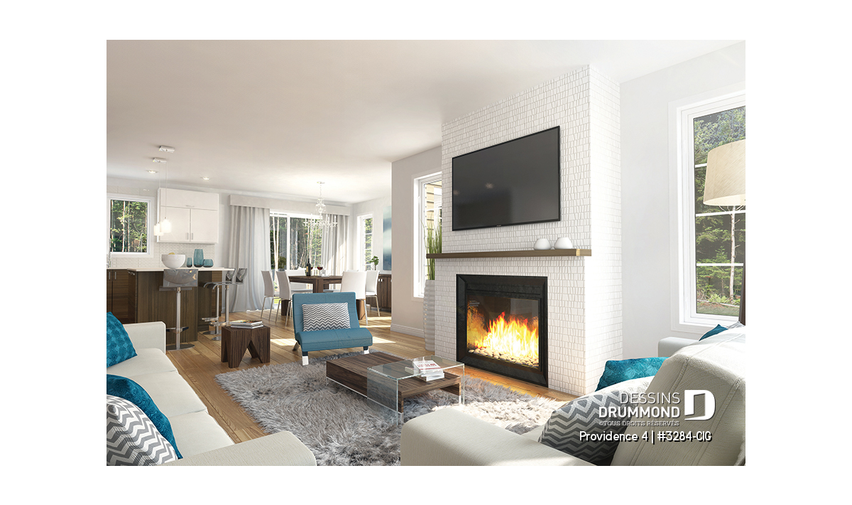 Ce modèle comporte aussi un plancher à aire ouverte à la salle de séjour, salle à dîner et cuisine. Cuisiner et jaser avec ses invités tout en écoutant crépiter le feu à la salle de séjour et sirotant un verre de rouge, c'est toujours tendance! De plus, le grand îlot à la cuisine favorisera la communication avec vos invités ou l’aide aux études tout en préparant le souper! Beaucoup de lumière naturelle dans l’espace salle à dîner et cuisine.