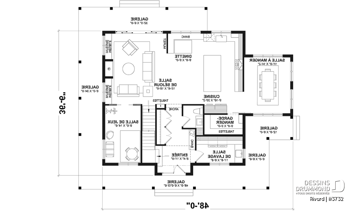 Aire ouverte, Chute à linge, Entrée ouverte sur 2 étages, Galerie 2-3 côtés, Foyer, Plafond à plus de 8', Salle à manger formel, Salle de jeux, Salle de lavage au rez-de-chaussée, Suite des maîtres à l'étage, Lavabo double, Meuble(s) encastré(s), Banquette, Dinette / Coin déjeuner, Tablettes, Bureau / Salle étude, Arche, Bain dans la douche, Cellier