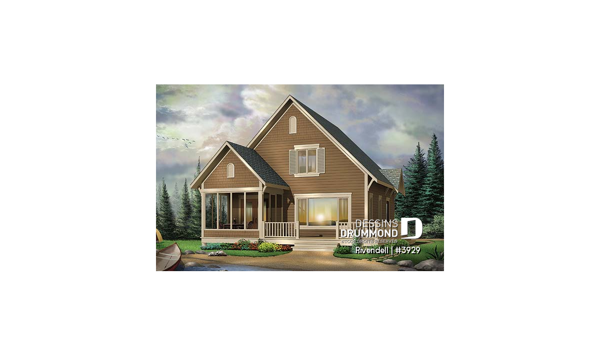 Plan de petit chalet (ski), rangement ski à l'entrée, 3 chambres, abri moustiquaire, îlot, 2 salles de bain