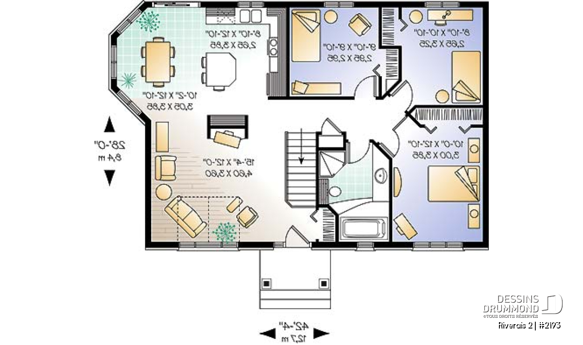 On doit aussi considérer le fait qu’il suggère une version deux chambres tout aussi attrayante ( 2192 possible à voir sur www.dessinsdrummond.com ) alors que dans chacune des versions on retrouve cette belle salle à manger tout en lumière dont on perçoit le volume en saillie sur le côté droit. On doit aussi tenir compte de cette salle de séjour de belles dimensions, dotée d’un plafond cathédrale partiel, et de cette salle de bain originale proposant un bain ainsi qu’une douche en coin.