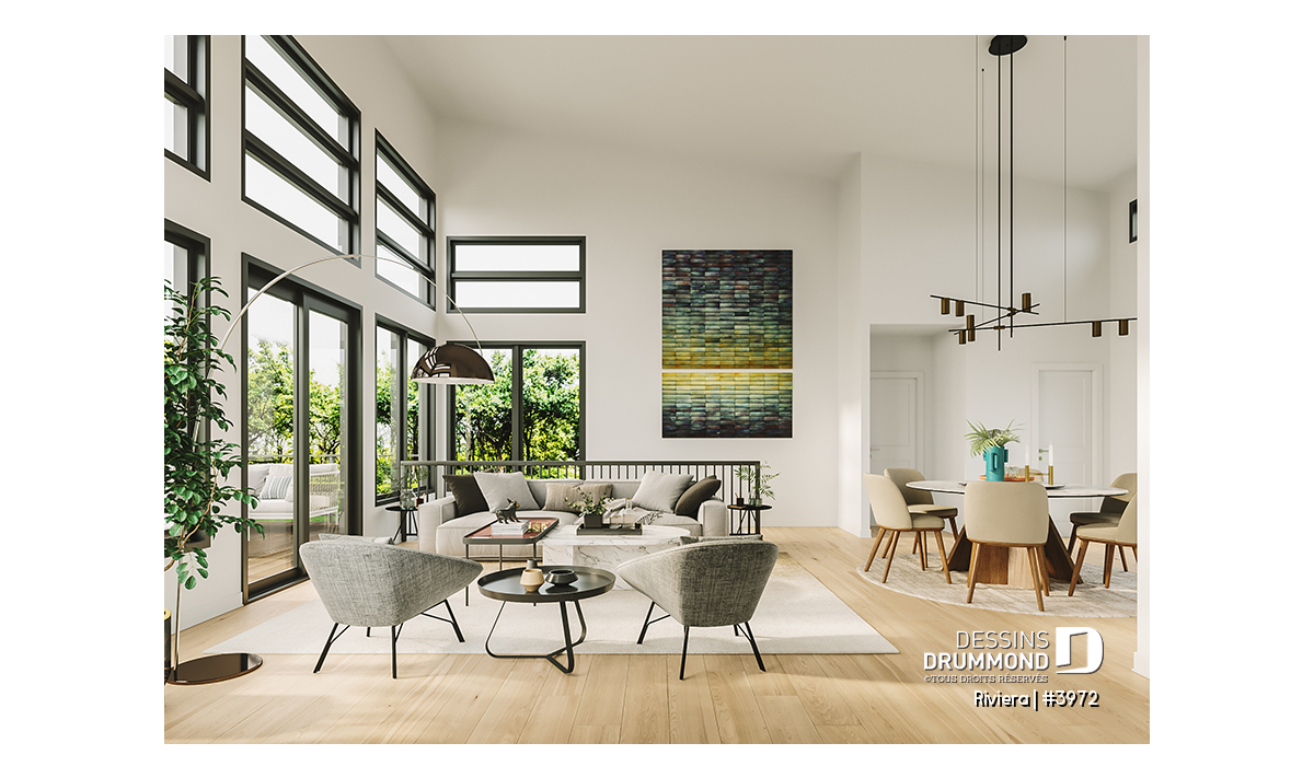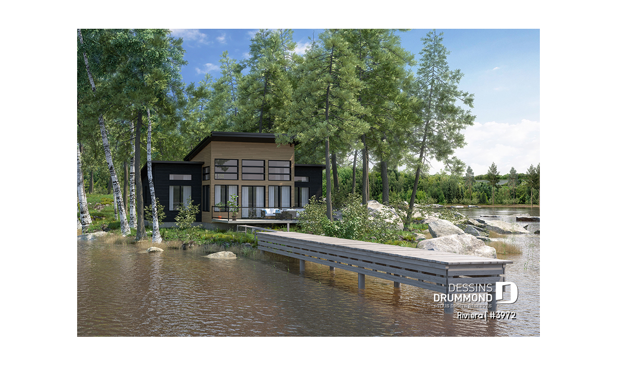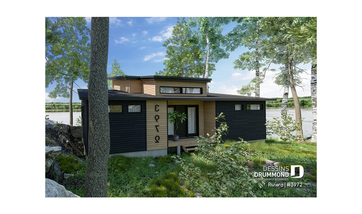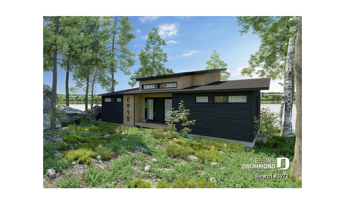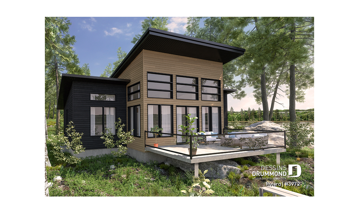 Le plan de maison RIVIERA (plan #3972) de style contemporain propose 1209 pieds carrés de surface aménagée au rez-de-chaussée, et la même superficie au sous-sol qui est non-fini.