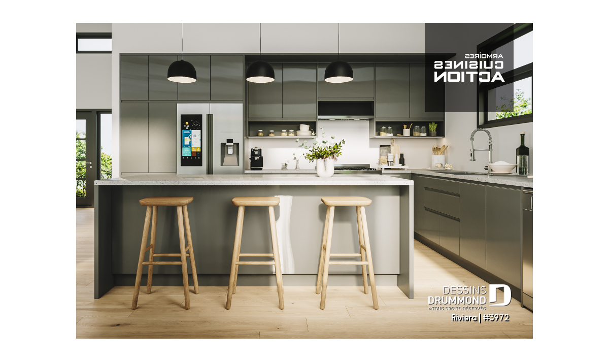 Ce plan de chalet moderne se démarque par son espace à aire au secteur salle à manger, salle de séjour et cuisine. Cette dernière comporte aussi un grand îlot central pouvant accommoder au moins 4 personnes.