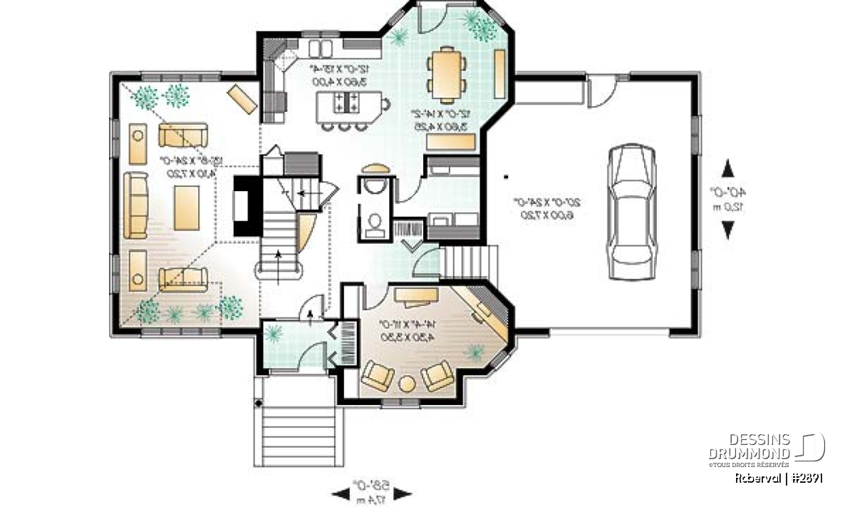 À l’intérieur, une fois le vestibule franchi, ce sont des espaces confortables qui s’organisent stratégiquement autour de l’escalier permettant ainsi une minimisation des corridors. On remarque d’abord une vaste salle de séjour, agrémentée d’un foyer et d’un plafond cathédrale, indispensable pour un tel espace, et, par la suite, une cuisine/dînette avec îlot central pratique, un espace salle à manger bien fenêtré et de volume original, une assez grande buanderie indépendante et un espace bureau des plus enviables occupant, avec un espace lecture ou divertissement, la tour située à l’avant.