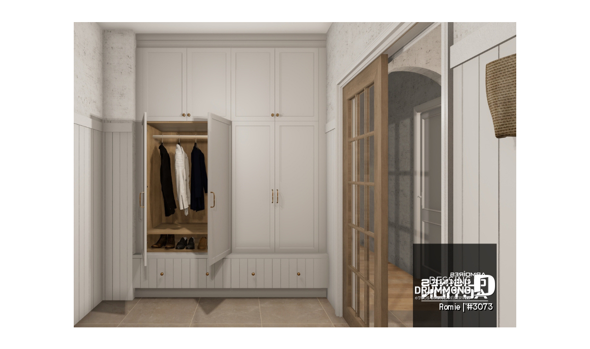 Grande entrée avec garde-robe et banc, accessible de l'entrée avant et du garage.
