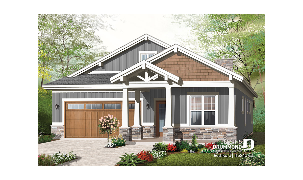 Plain pied de style Craftsman avec garage double, idéal pour terrain étroit.