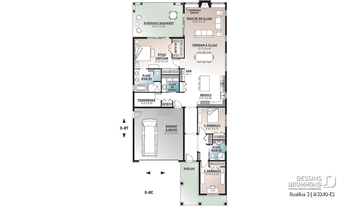 Pour ce 3240-ES, appréciez d’abord un plan de 3 chambres sur un même plancher avec plafond à 9pi partout, un garage double, un secteur cuisine/dînette/salle à manger/salle de séjour entièrement ouvert avec foyer, mobilier intégré et accès à une grande terrasse abritée de 20pi x 14pi aussi accessible de la suite des maîtres. Ici, en plus de l’espace mécanique/rangement du rez-de-chaussée, ce plan propose un attique/rangement de tout près de 450pi2 accessible du garage via un escalier escamotable.