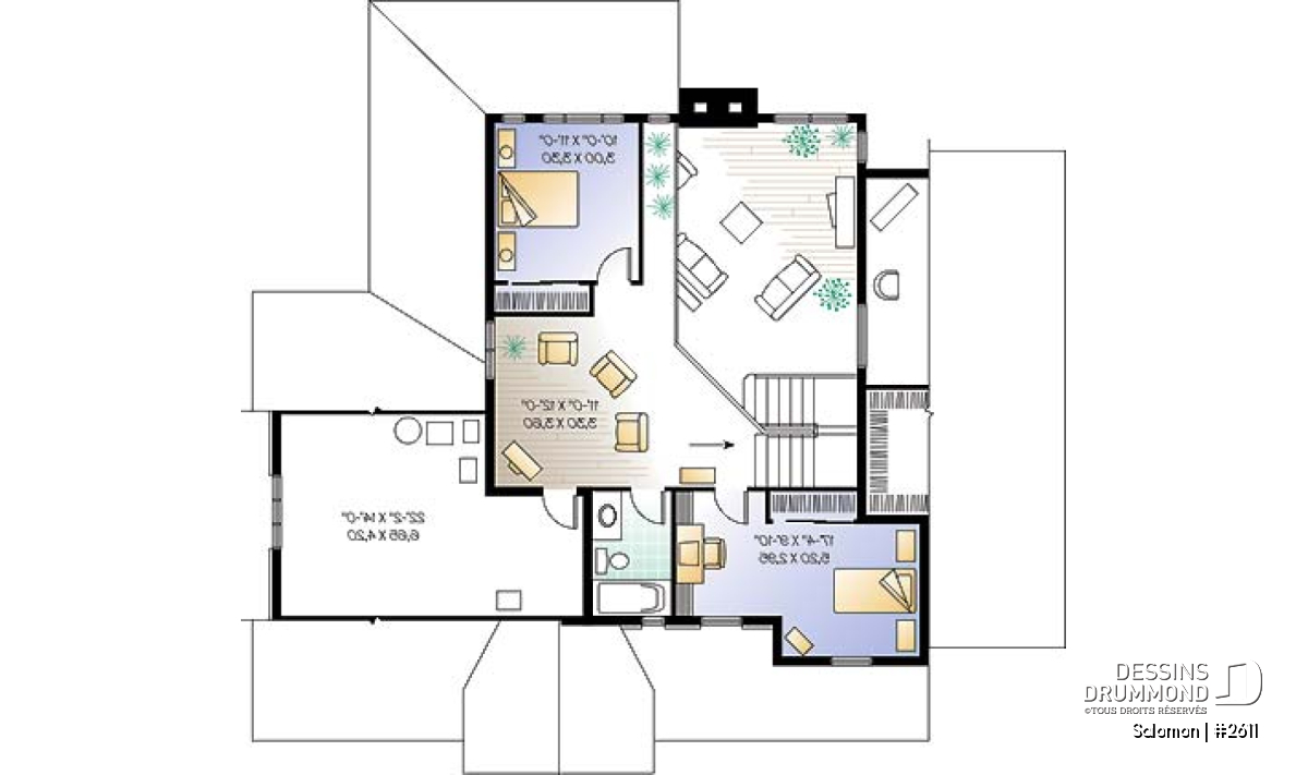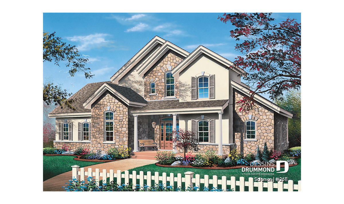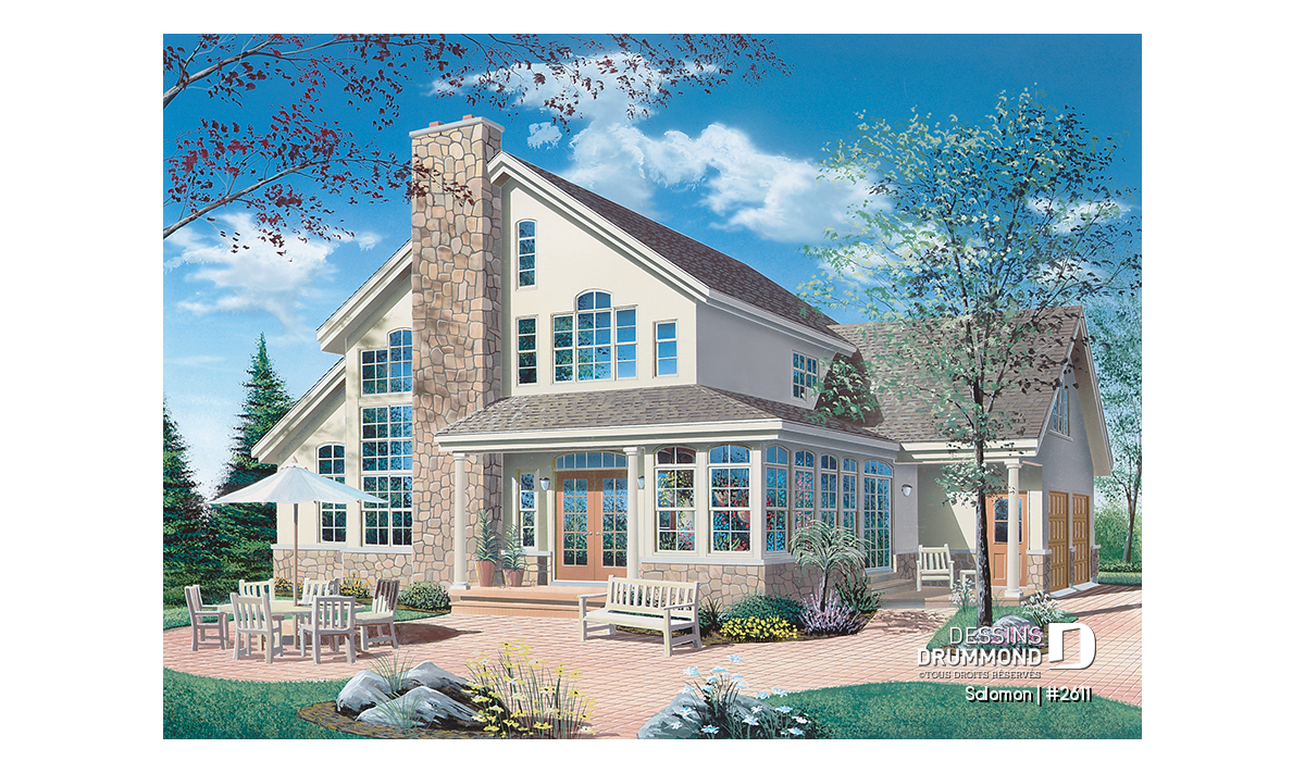 Conçu d’abord et avant tout pour répondre aux besoins spécifiques d’un concours de design résidentiel américain dont : une surface totale maximale de 2000 pi2 ( excluant garage, espace boni, verrière et sous-sol ), une chambre des maîtres et une verrière indépendante au rez-de-chaussée ainsi qu’un garage double, le modèle 2686 a suscité l’intérêt escompté dès son arrivée sur le marché et nous a d’ailleurs obligé à lui faire une version similaire soit le modèle 2611. Lors du même concours, Dessins Drummond a aussi proposé le modèle 2688 pour lequel la verrière se traduit par une tourelle entièrement vitrée sur l’arrière de la maison et à laquelle on a intégré un escalier en colimaçon afin d’accéder à l’ensemble des plantes en suspension. À voir sur http://www.dessinsdrummond.com/