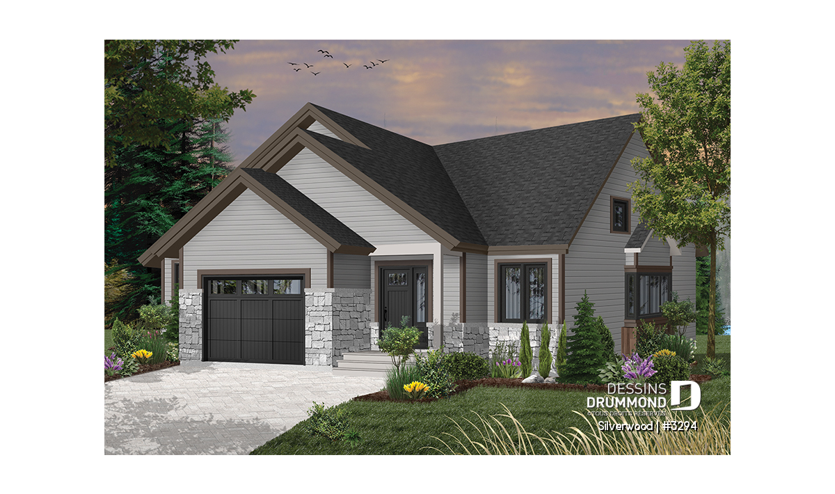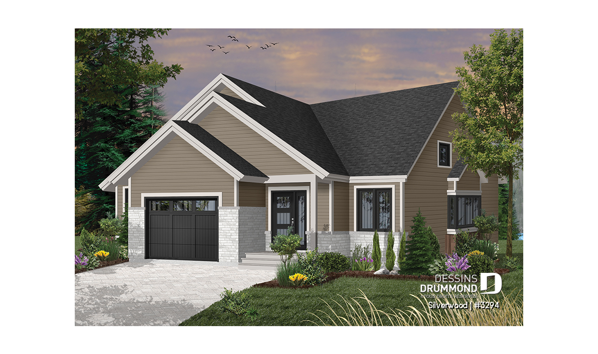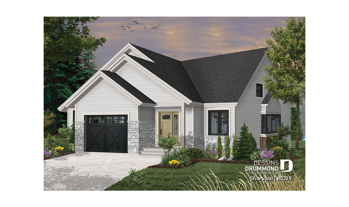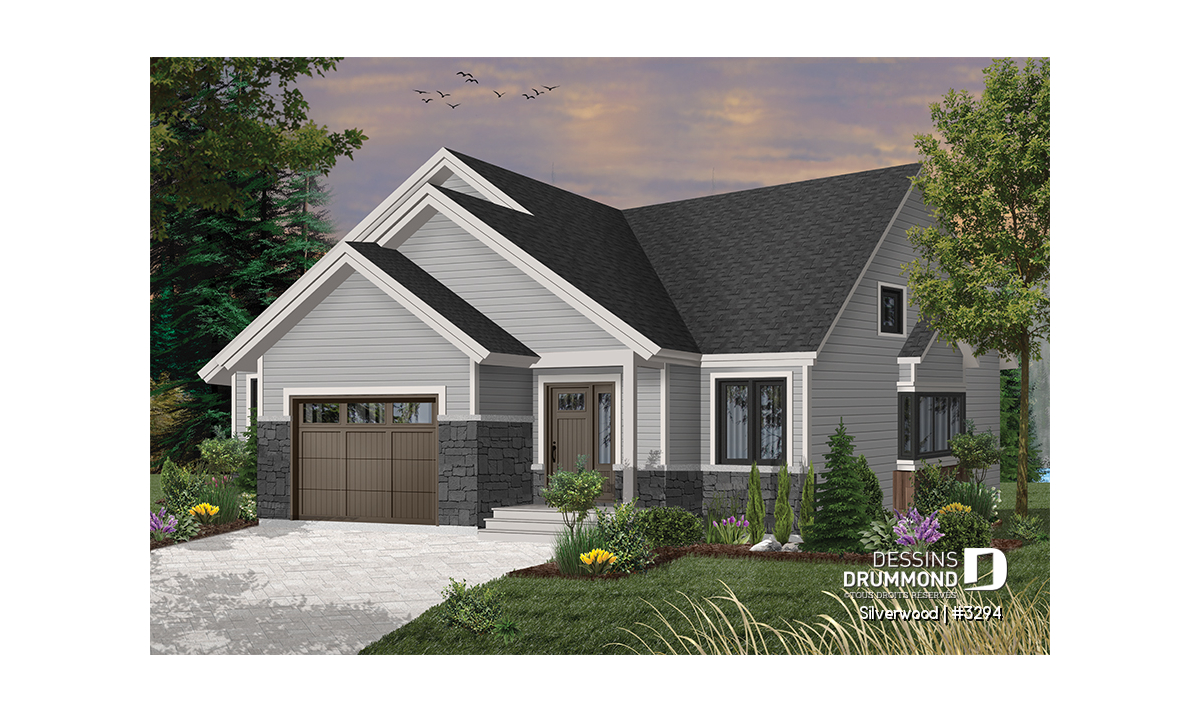 Ce nouveau plan de maison de plain-pied 3 chambres avec garage, plan no. 3294 de Dessins Drummond, aussi nommé Silverwood, propose un aménagement pratique de toutes les chambres et airs communs sur un seul et même plancher. Cette formule plait généralement aux familles avec jeunes enfants, permettant ainsi aux parents d’être à proximité de leurs jeunes.