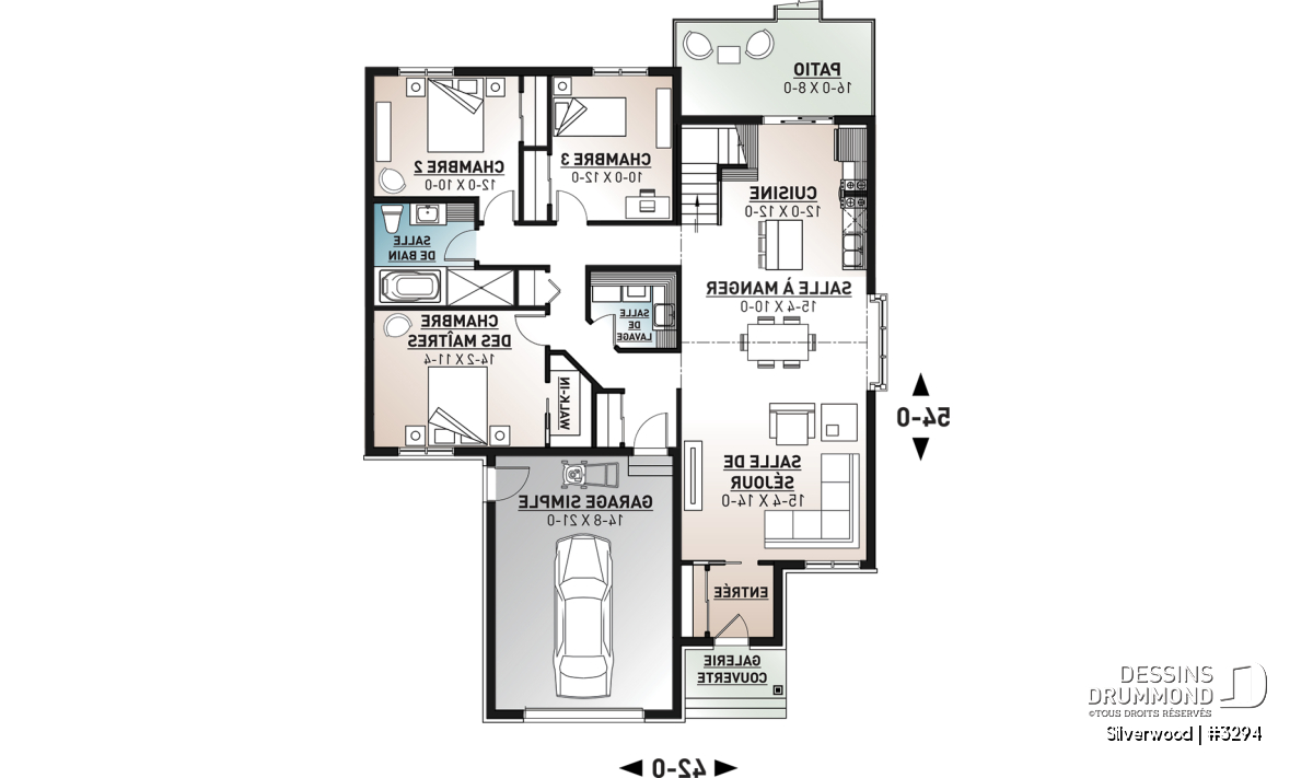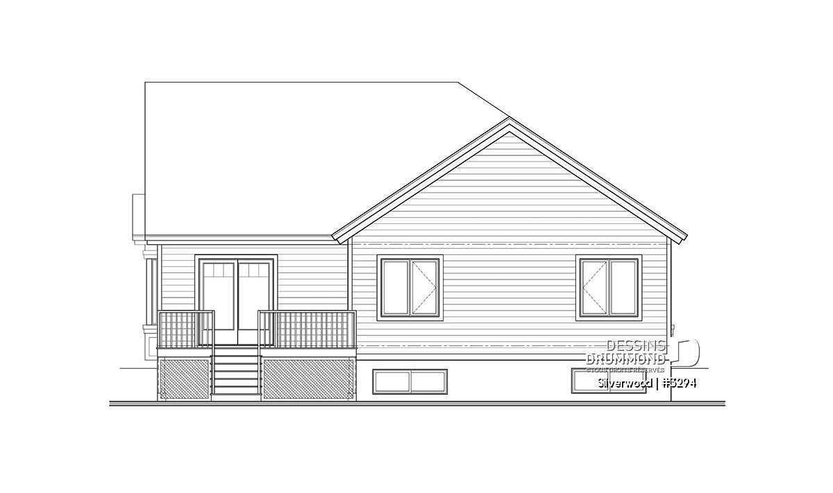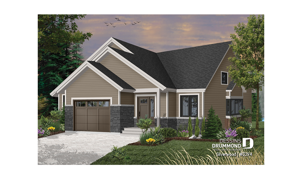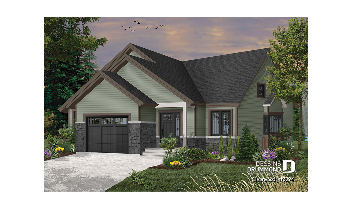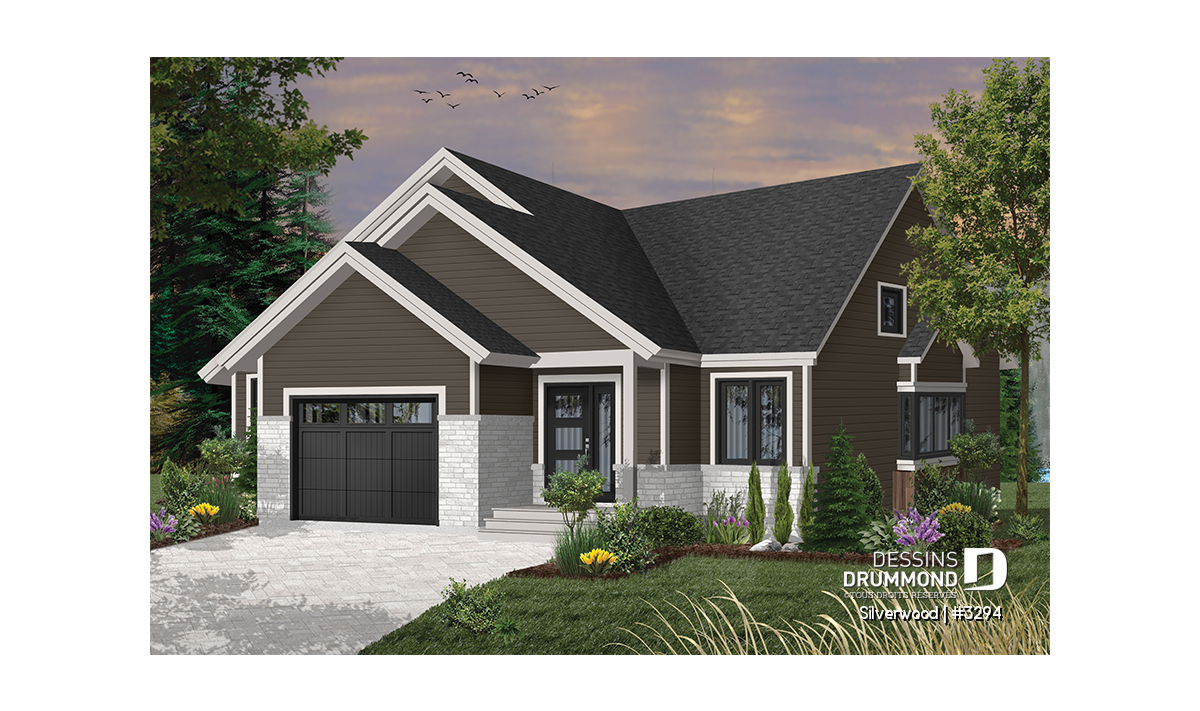 Ce nouveau plan de maison de plain-pied 3 chambres avec garage, plan no. 3294 de Dessins Drummond, aussi nommé Silverwood, propose un aménagement pratique de toutes les chambres et airs communs sur un seul et même plancher. Cette formule plait généralement aux familles avec jeunes enfants, permettant ainsi aux parents d’être à proximité de leurs jeunes.
