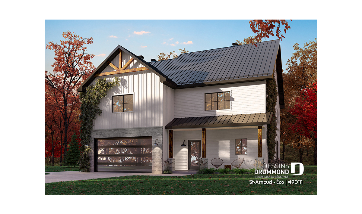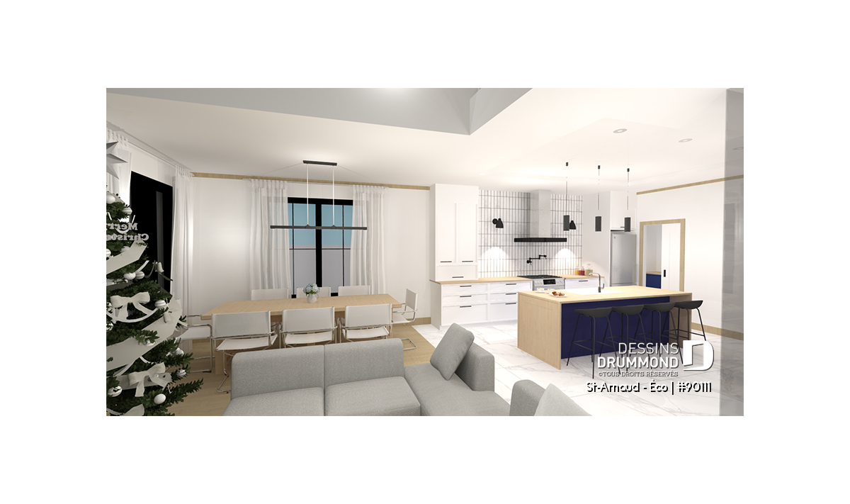 Conçue pour une orientation de la cour arrière au sud, cette maison conserve les caractéristiques marquantes de l’originale tout en proposant de nouvelles idées plus optimales. Tout d’abord, nous retrouvons une entrée fermée qui communique également avec le garde-manger de la cuisine. Il y a ensuite la grande aire ouverte avec une double hauteur au niveau du salon ainsi qu’un foyer qui donne beaucoup de prestance à l’espace. À partir du salon, nous pouvons accéder à la terrasse couverte située au sud-ouest, parfaite pour profiter des belles fins de journées. Finalement, il y a un grand vestiaire pour le quotidien qui communique directement avec le garage.