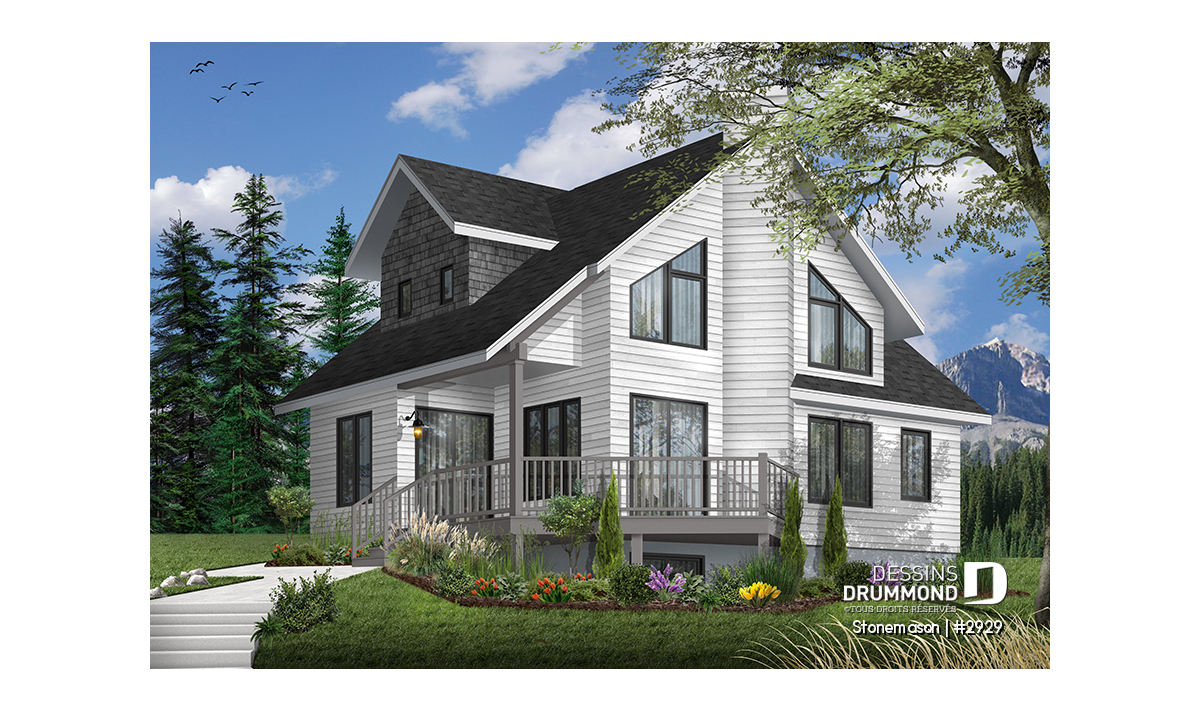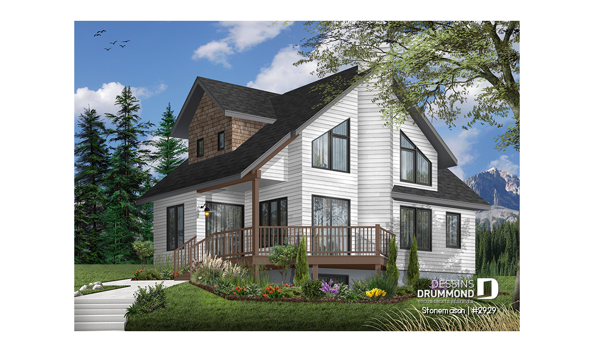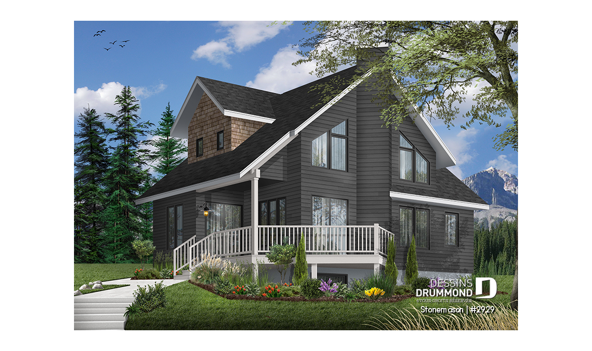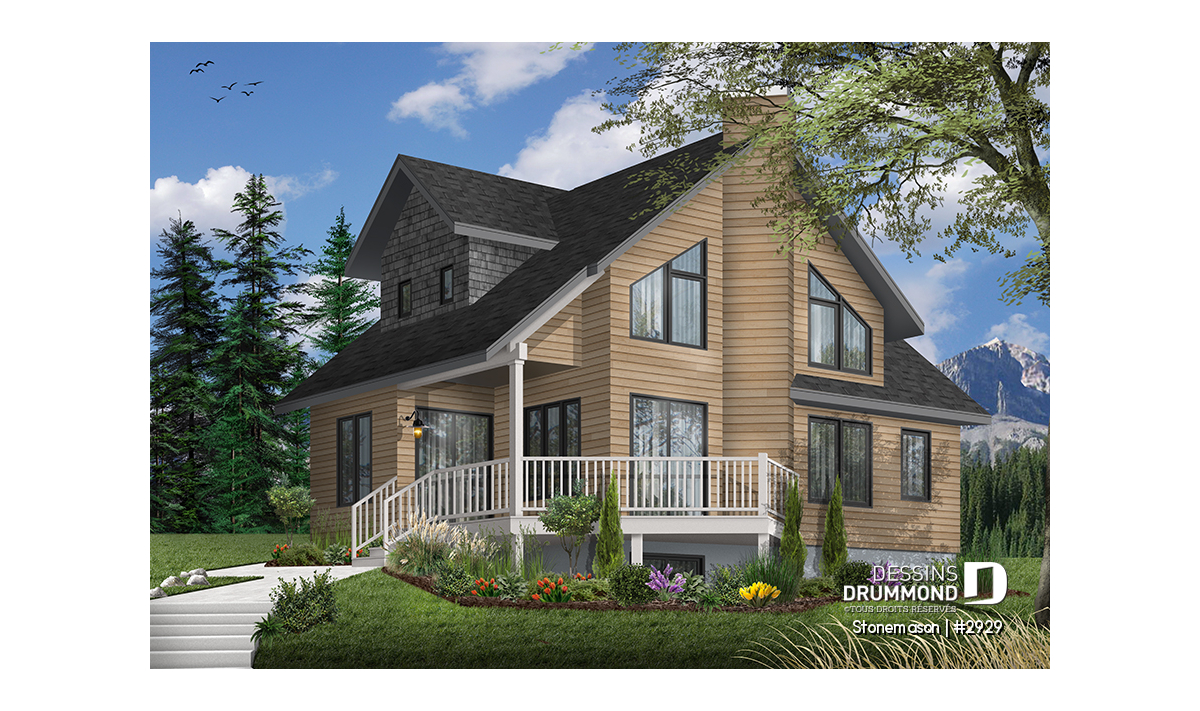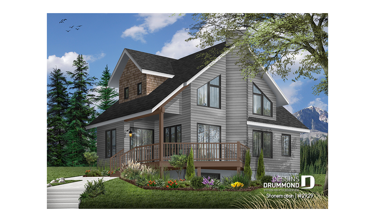 Plan de maison / chalet rustique, grand vestiaire, grand salon, 2 chambres, 2 s.bain, mezzanine