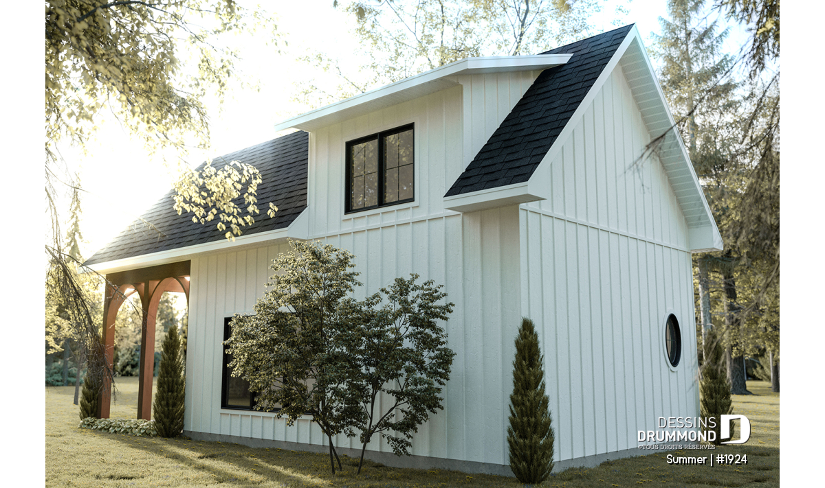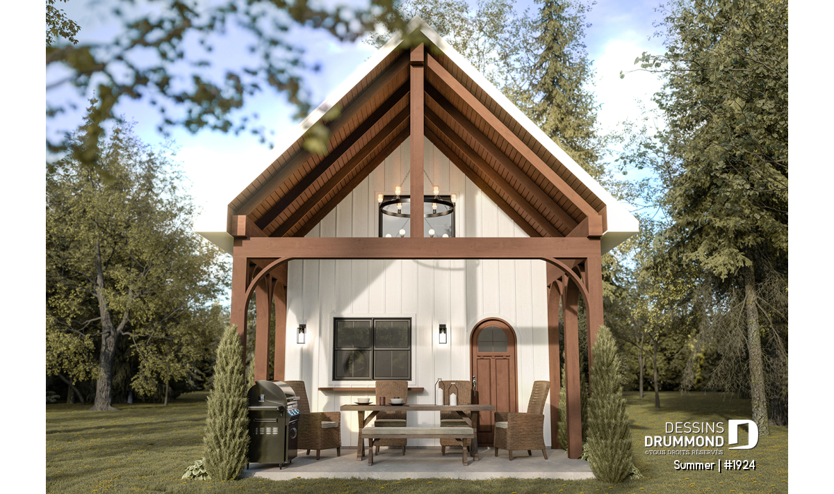 Le plan de mini-maison SUMMER (plan #1924) propose 636 pieds carrés aménagés sur 2 étages. La fondation prévue est une dalle monolithique, mais d'autres fondations sont disponibles, selon vos besoins. Son look vieille église rénovée lui confère un charme indéniable et chaleureux à la fois.