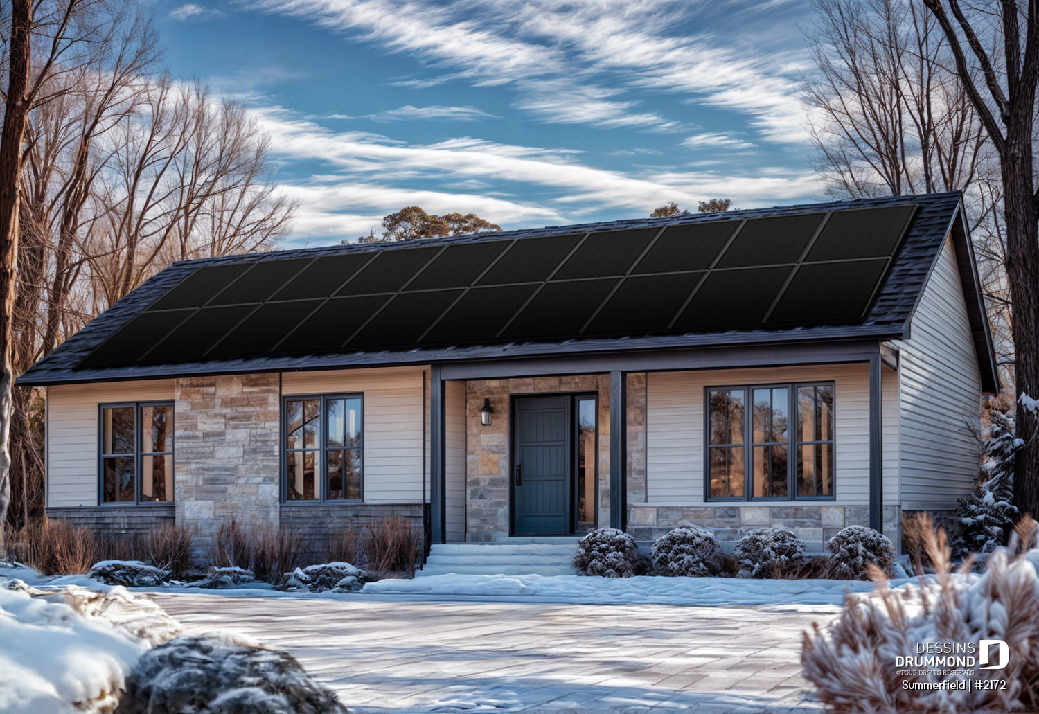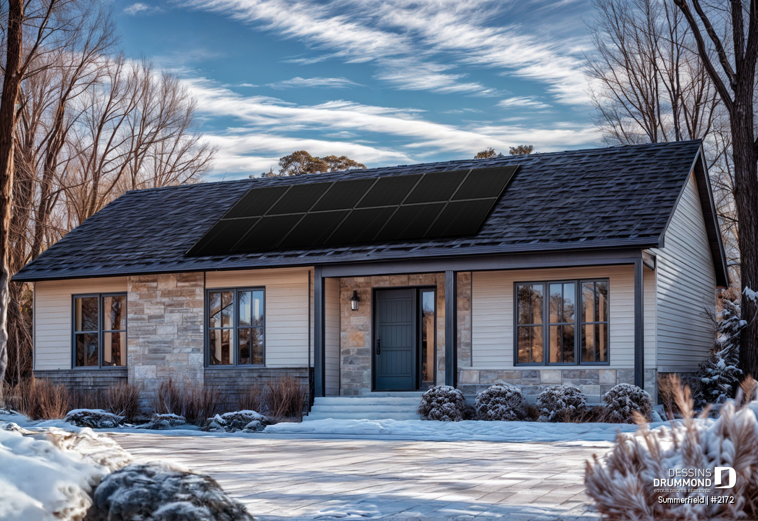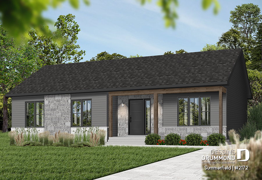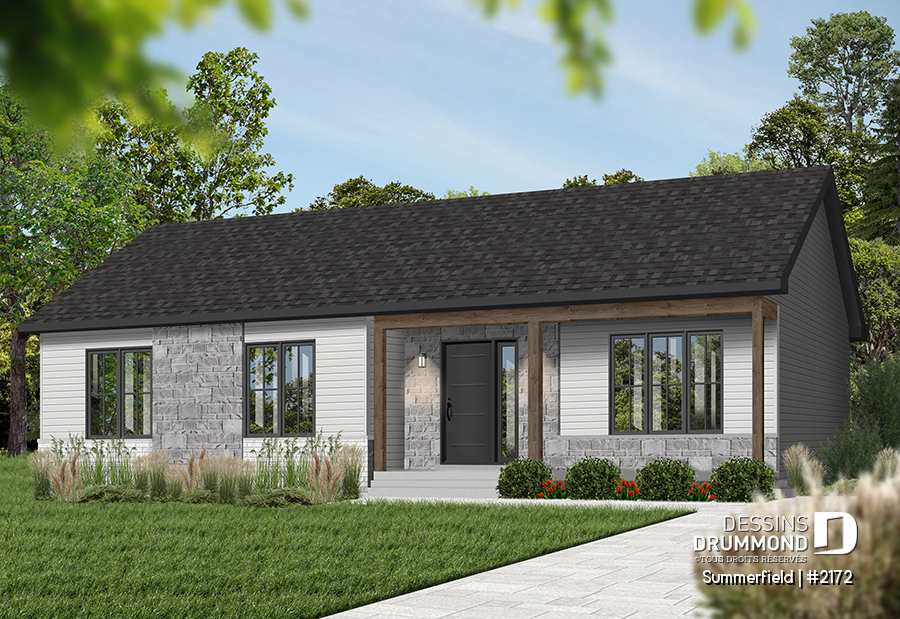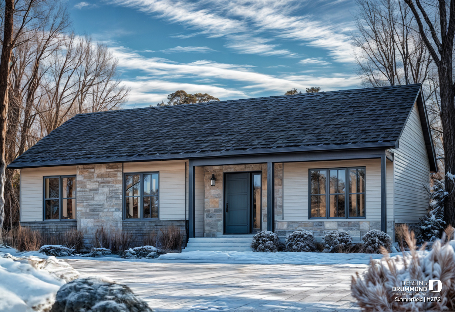 Ce plain-pied de style ranch séduit par son allure simple, chaleureuse et intemporelle. Sa façade élégante, rehaussée d’une touche de pierre naturelle et d’un choix de couleurs sobres, confère à cette maison un caractère à la fois rustique et raffiné. Son architecture compacte et bien proportionnée en fait un choix idéal pour les auto-constructeurs à la recherche d’un projet abordable, bien pensé et facile à réaliser.