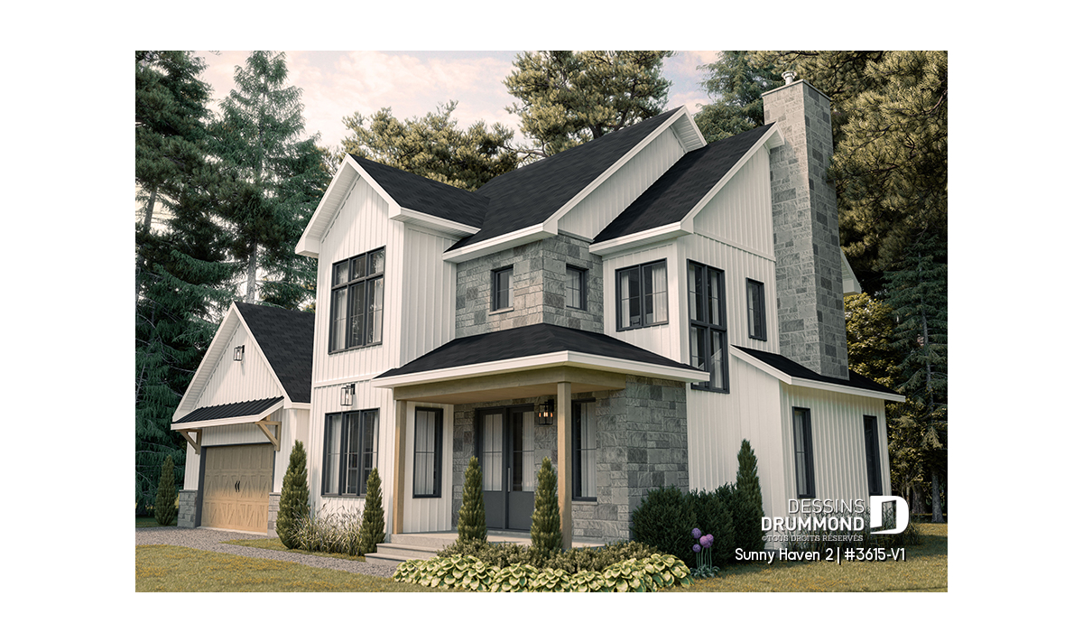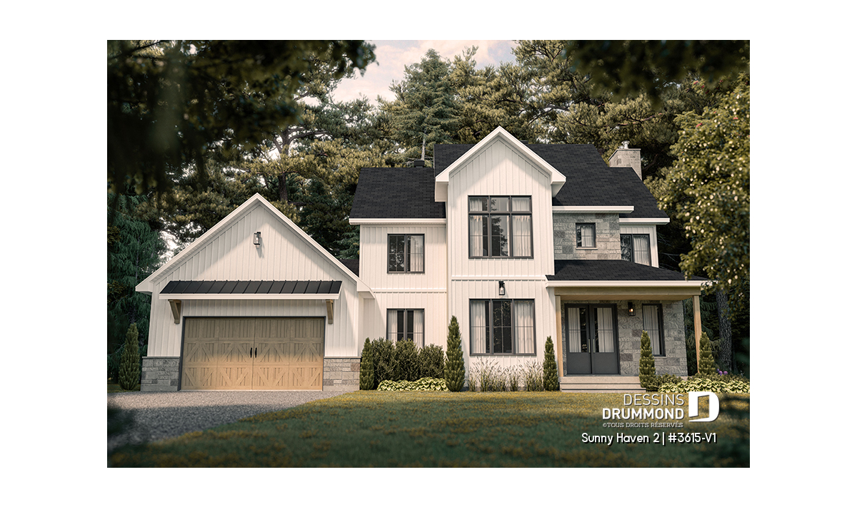 Le modèle Sunny Haven 2 (#3615-V1) propose une interprétation raffinée du style Farmhouse moderne, combinant une architecture chaleureuse à une organisation intérieure pensée pour le confort quotidien. Ce plan se distingue par son équilibre entre élégance, fonctionnalité et qualité de vie, offrant une expérience résidentielle à la fois accueillante et durable.