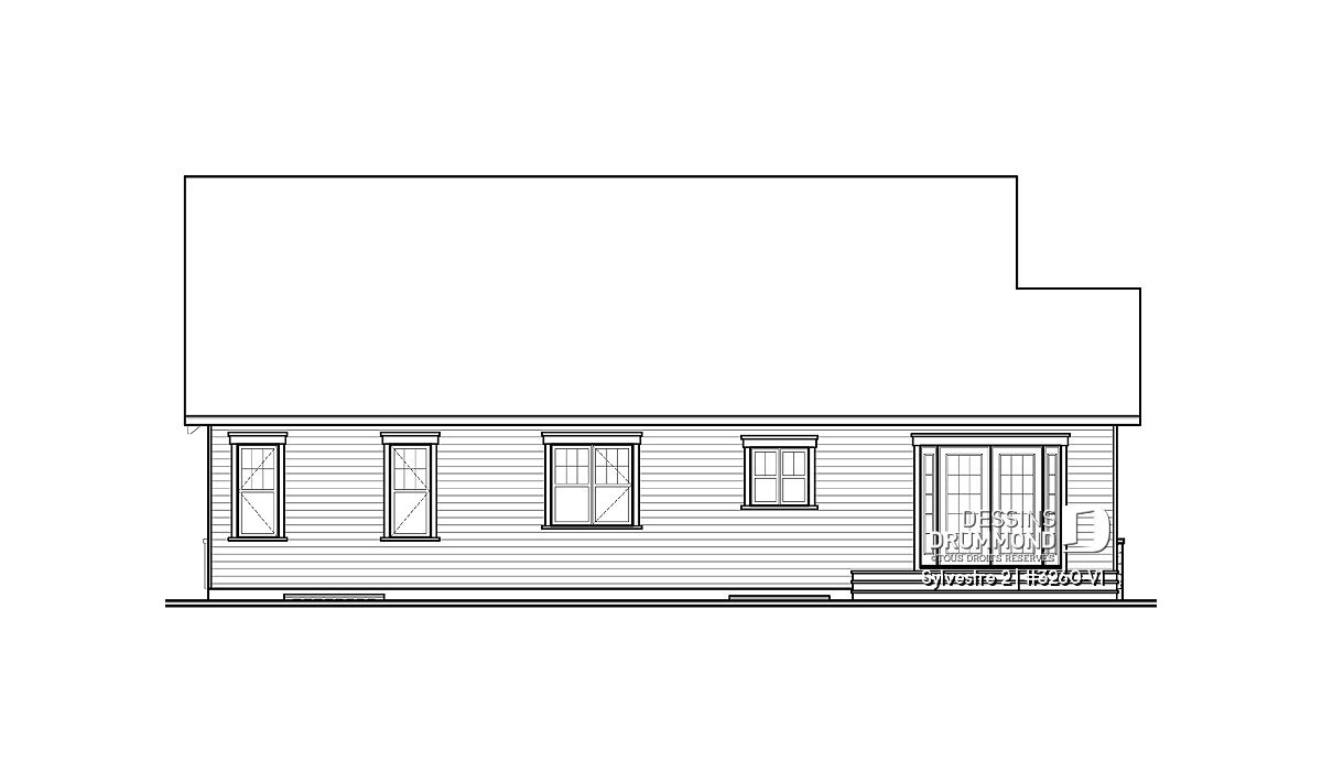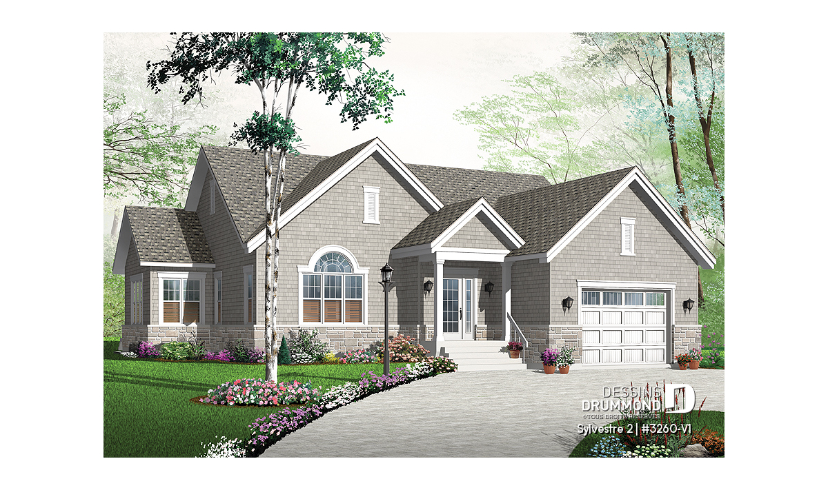 Comme bien des gens, vous avez craqué pour le bungalow 3260 de la collection de maisons neuves de Dessins Drummond et n’avez pas encore acheté votre plan ? Appréciez donc cette version agrandie de 245 pi2 ( équivalent d’une pièce additionnelle de 15’ x 16’ ) pour le rez-de-chaussée et de tout près de 120 pi2 ( équivalent de 10’ x 12’ ) pour le garage.