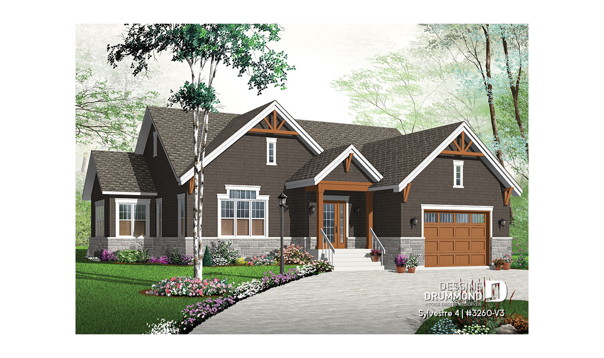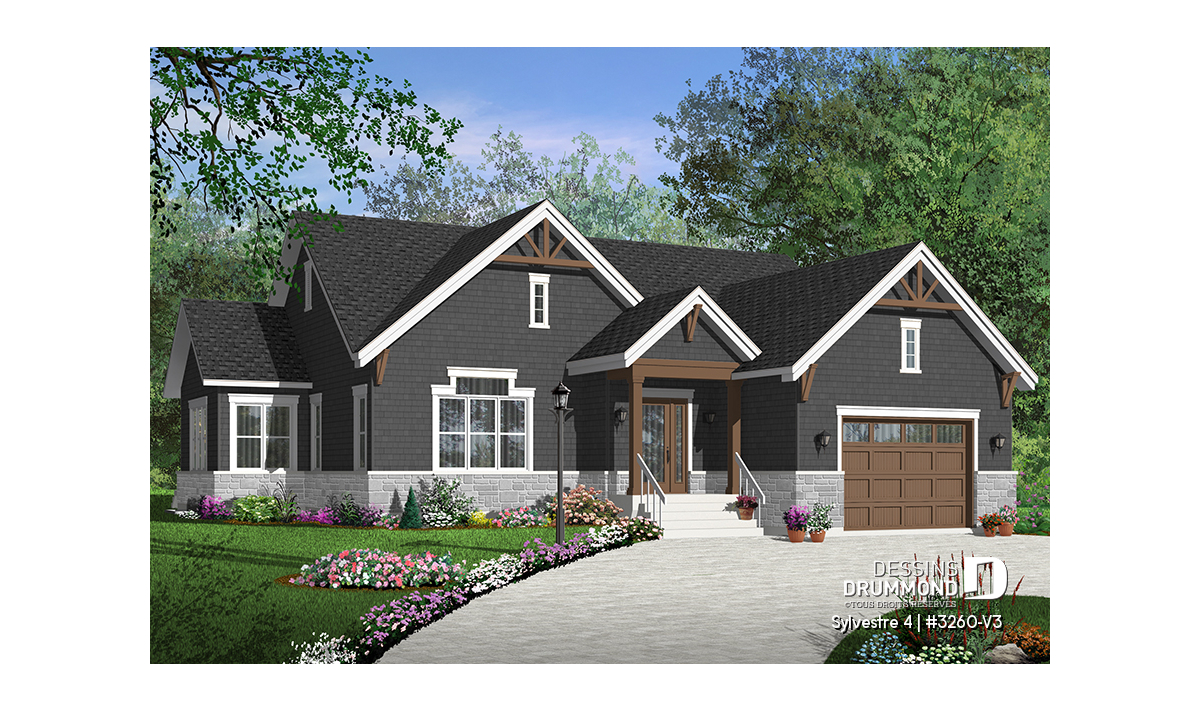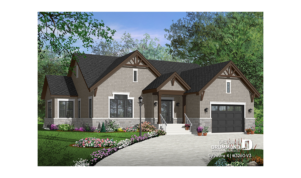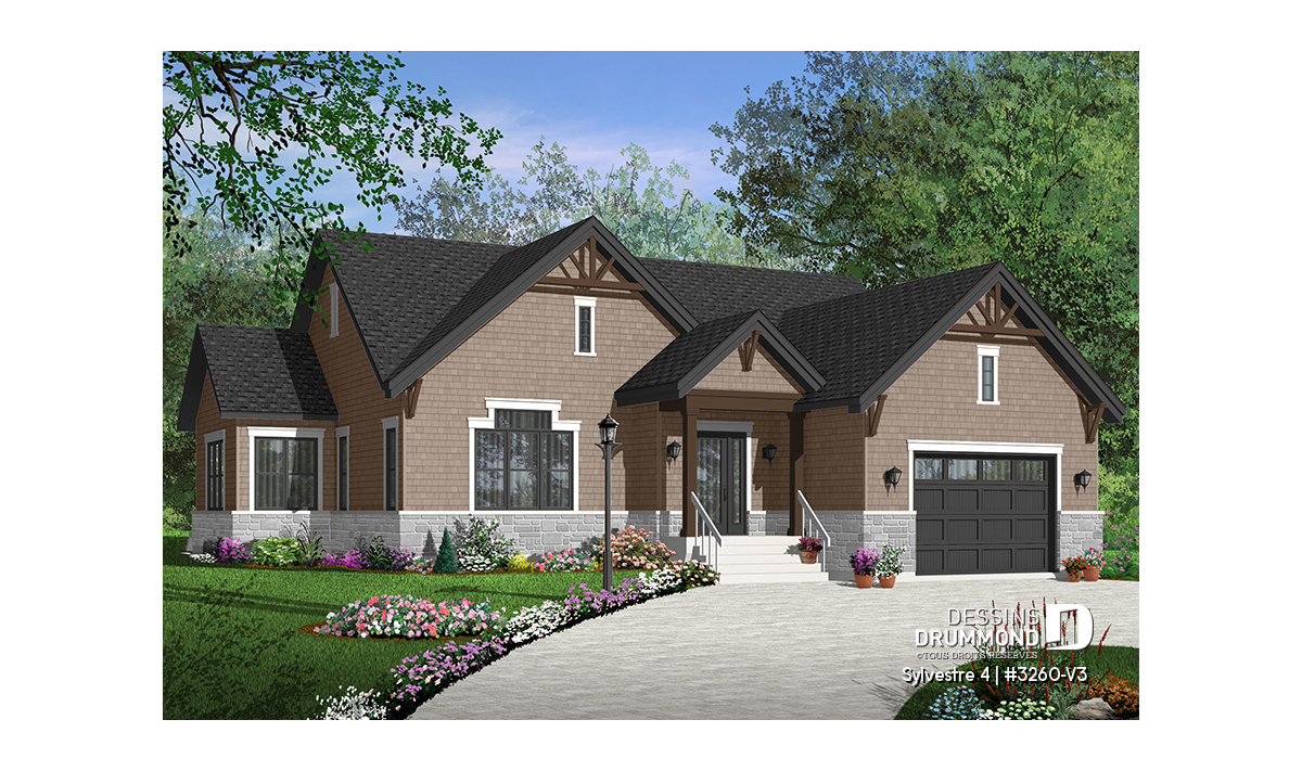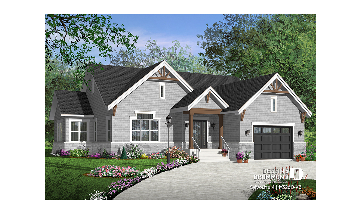 Version couleur no. 1 - Vue avant - Plan de maison plain-pied 3 chambres, grande suite des maîtres, 2.5 salles de bain, garage double, foyer,  - Sylvestre 4