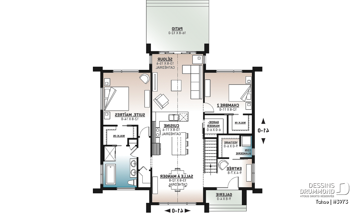 Le plan 3973 aussi appelé Tahoe, propose 1447 pi.carré au rez-de-chaussée. Il contient deux chambres à coucher de bon format dont la chambre des parents avec walk-in et un accès direct à la salle de bain. Cette dernière propose deux lavabos, une grande douche séparée du bain et du rangement. La chambre secondaire a un walk-in.