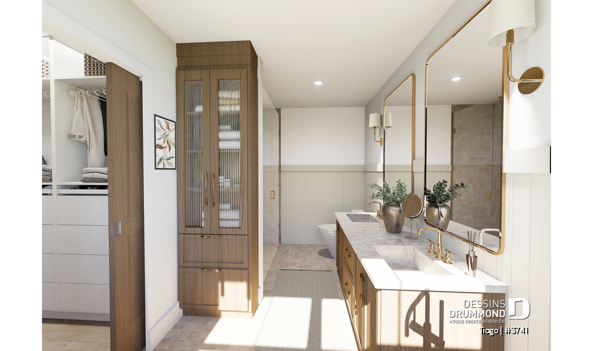 L’étage est un véritable cocon pour la famille. La chambre des maîtres séduit par son walk-in spacieux et sa salle de bain privée digne d’un hôtel : bain autoportant devant une grande fenêtre, douche spacieuse et double lavabo pour un maximum de confort. Deux chambres secondaires, une seconde salle de bain complète, une salle de lavage et une grande penderie complètent cet étage fonctionnel et bien pensé.