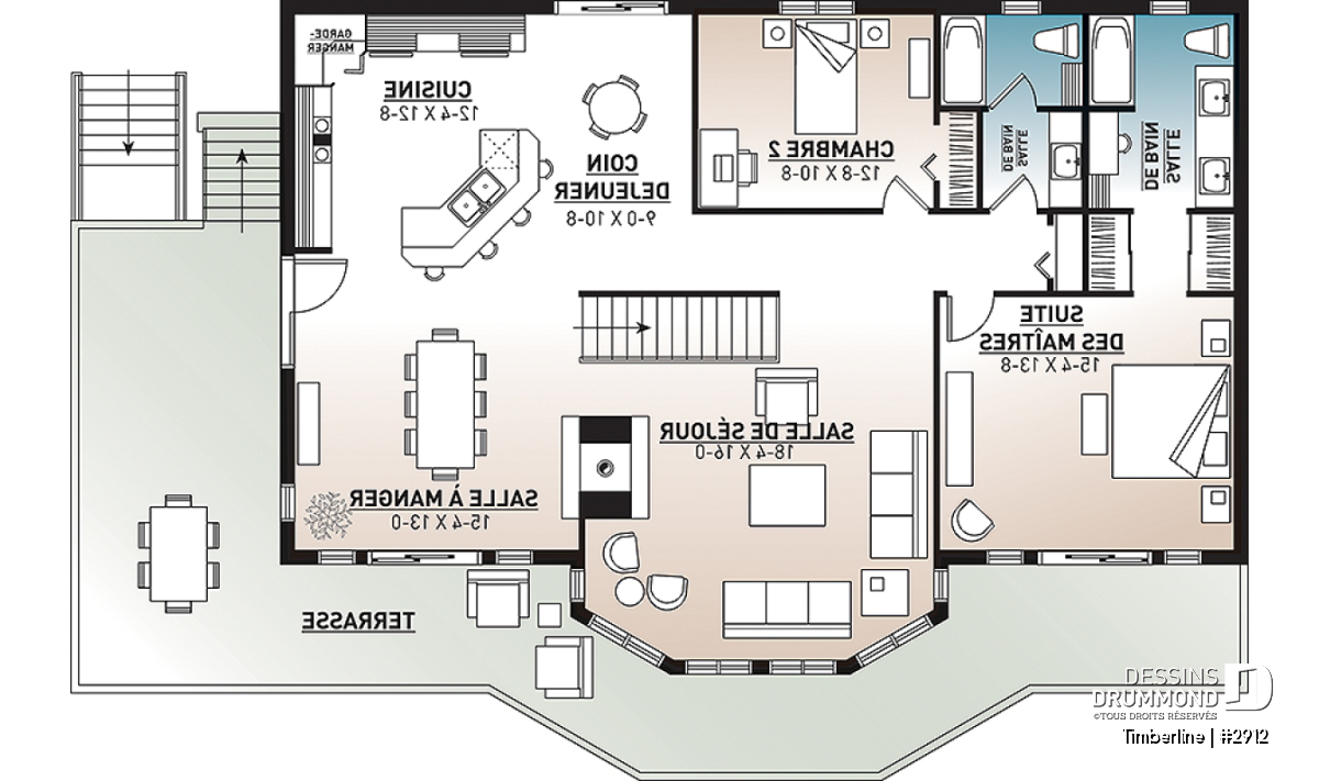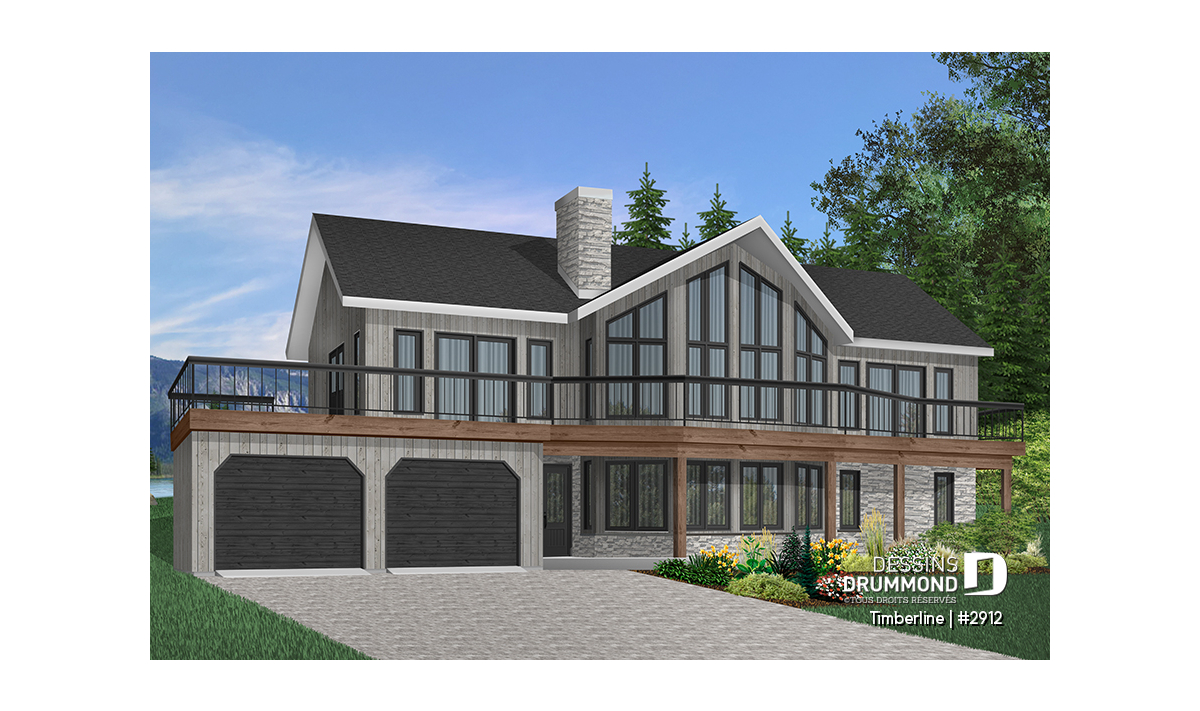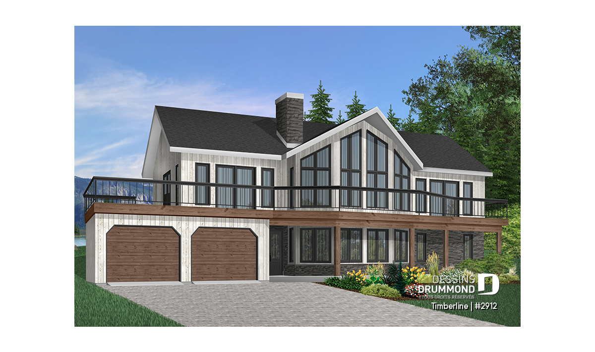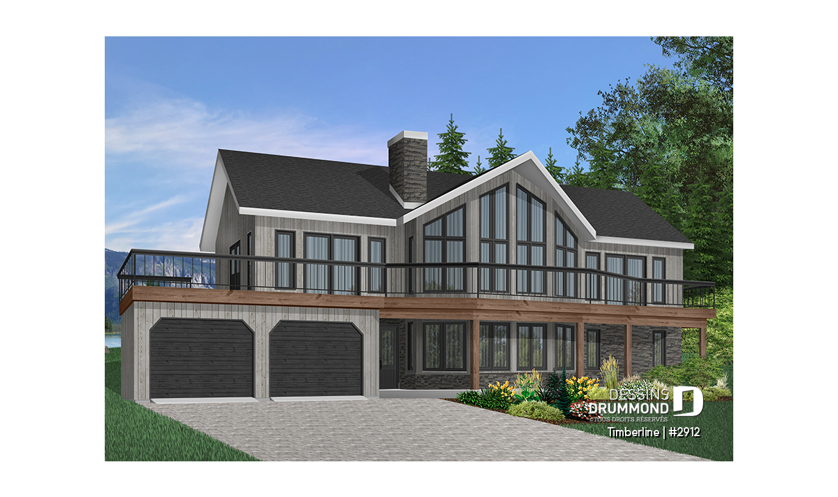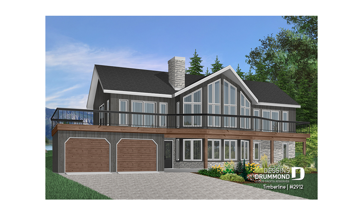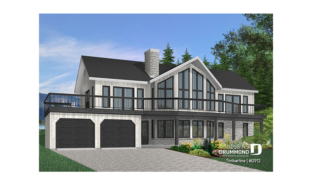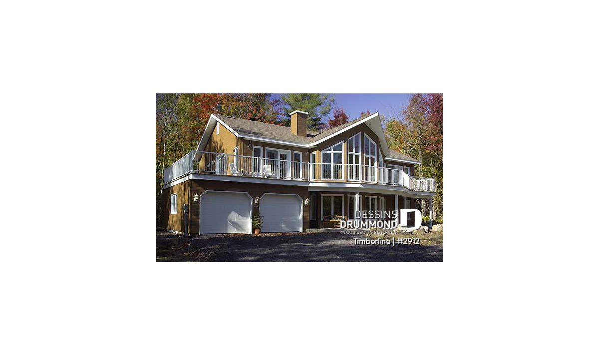 Plafond cathédrale prévu à la salle de séjour dotée aussi d'un foyer deux faces ouvert sur la salle à manger. Cuisine avec garde-manger en coin et îlot-lunch central. Suite des maîtres prévue au rez-de-chaussée. Salle familiale avec foyer. Cinq chambres prévues au plan. Garage double avec terrasse au-dessus.