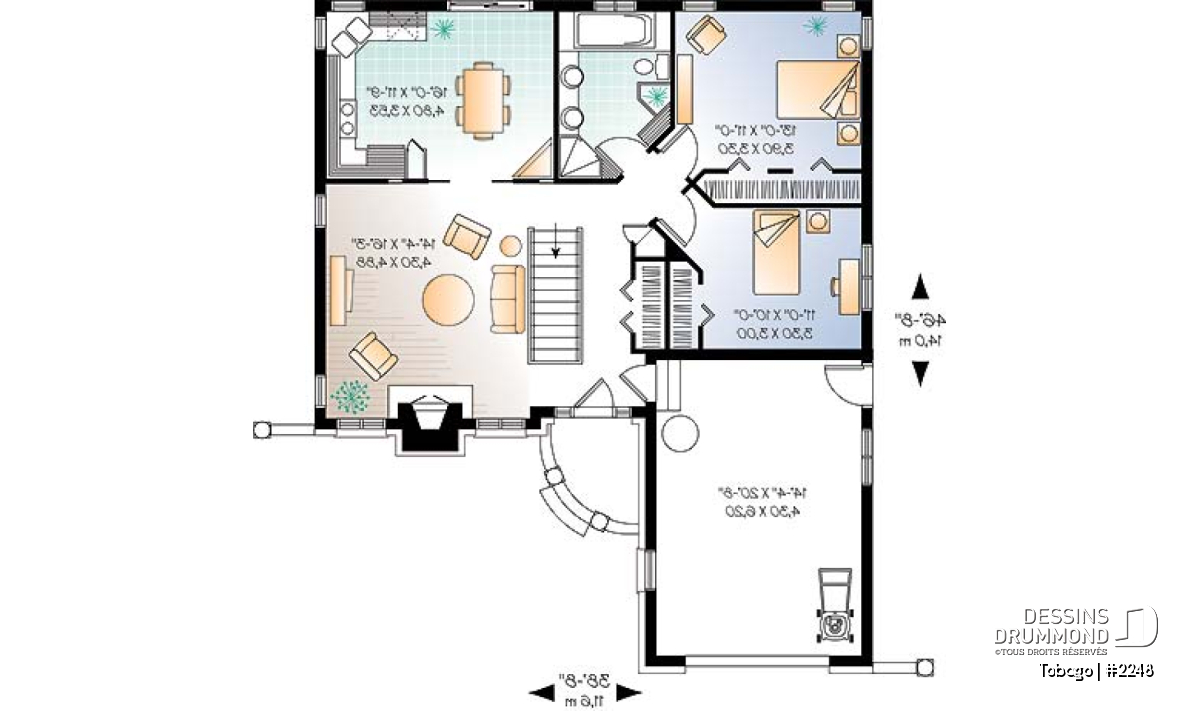 Plan de style américain, 2 chambres, foyer au salon, grande cuisine, éviers doubles à la salle de bain, garage