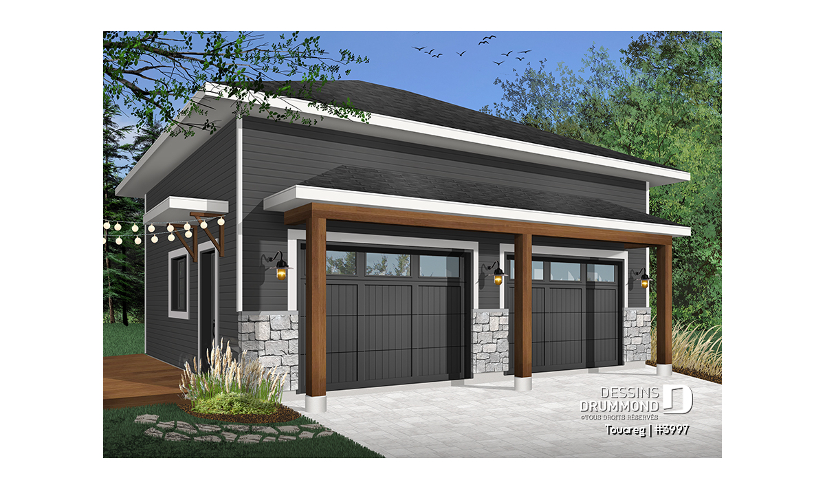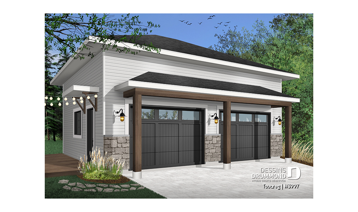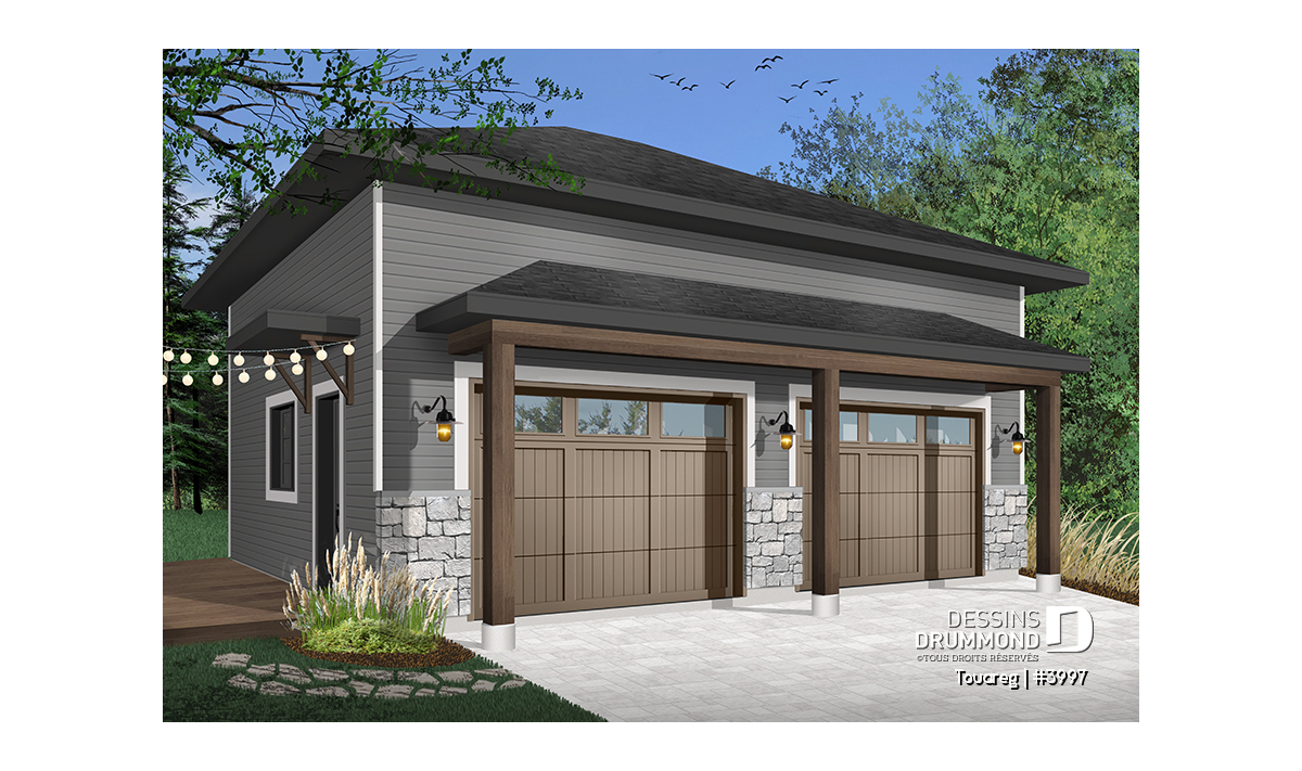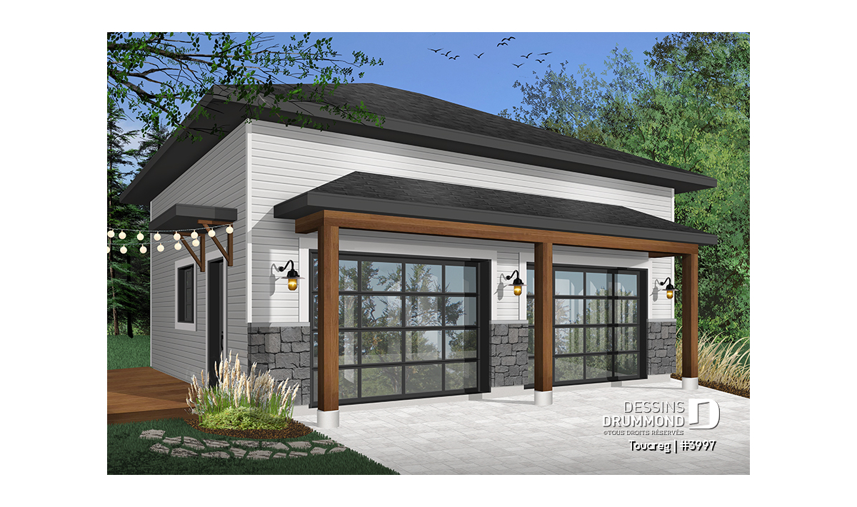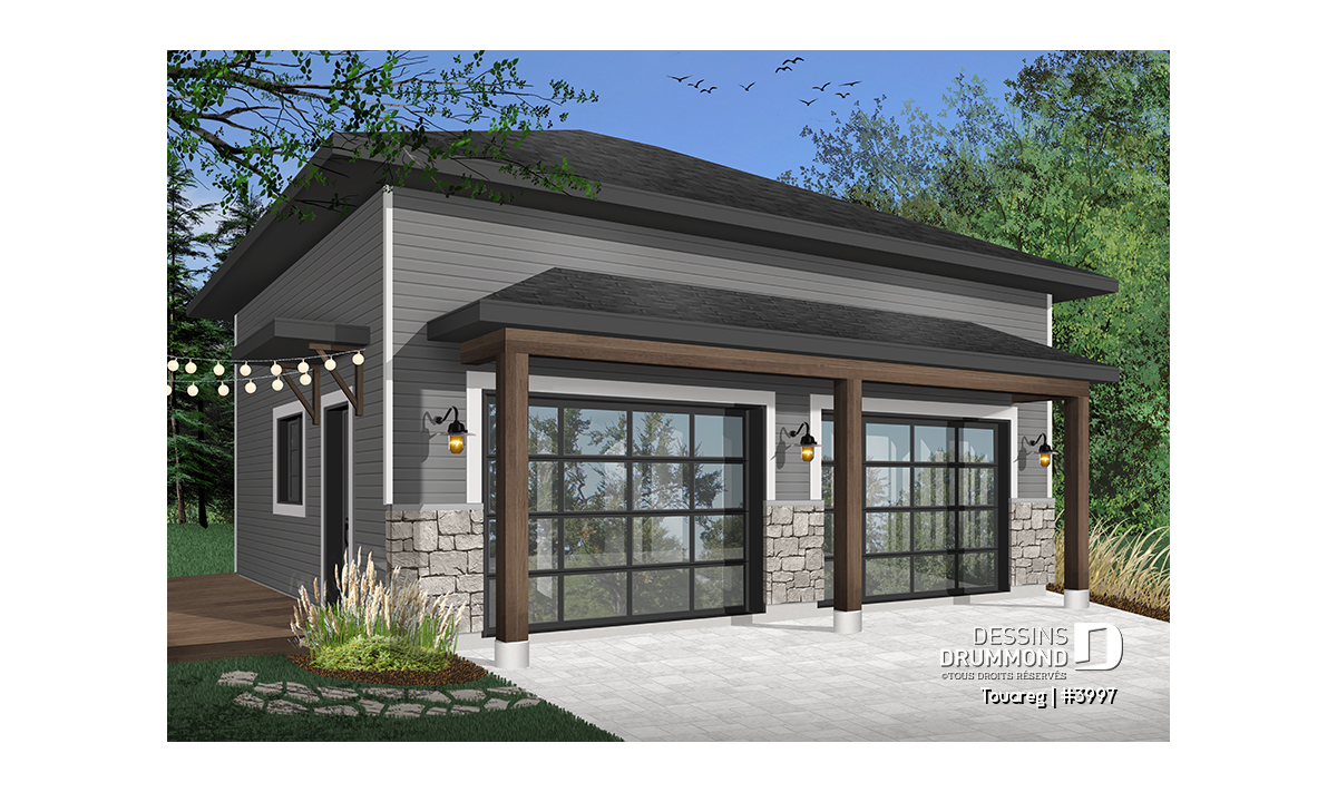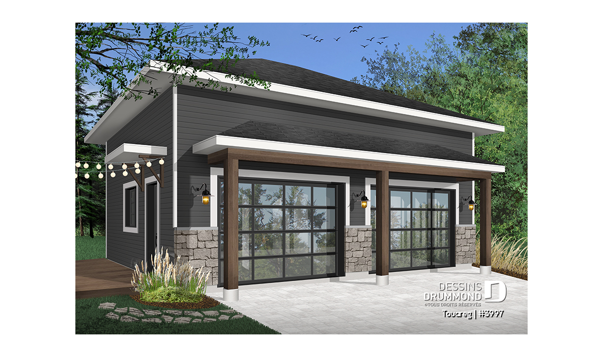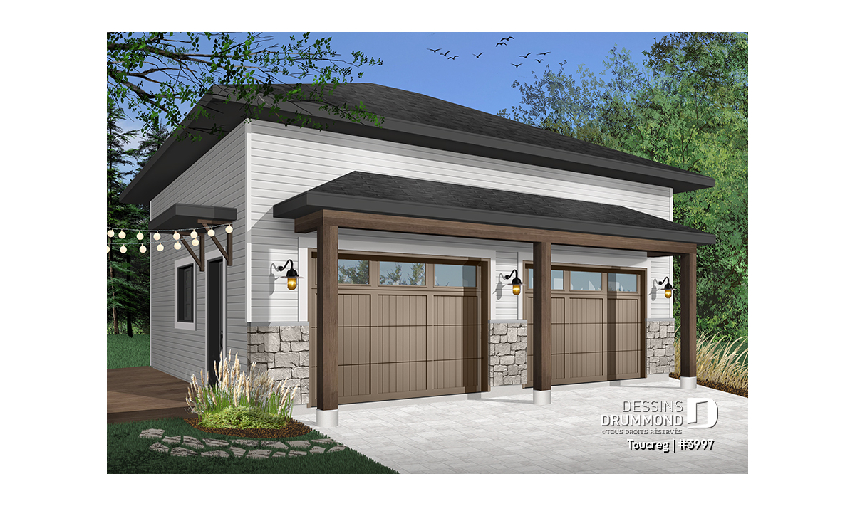 Plan de garage double, style moderne rustique, plafond à 12 pieds.