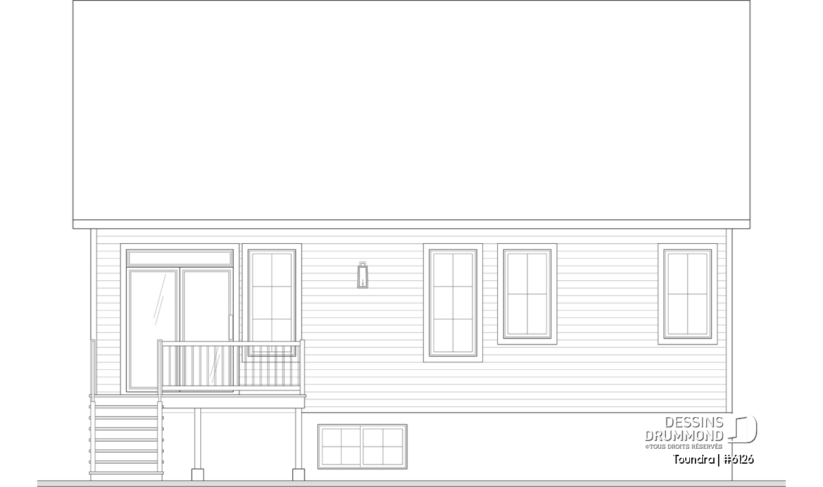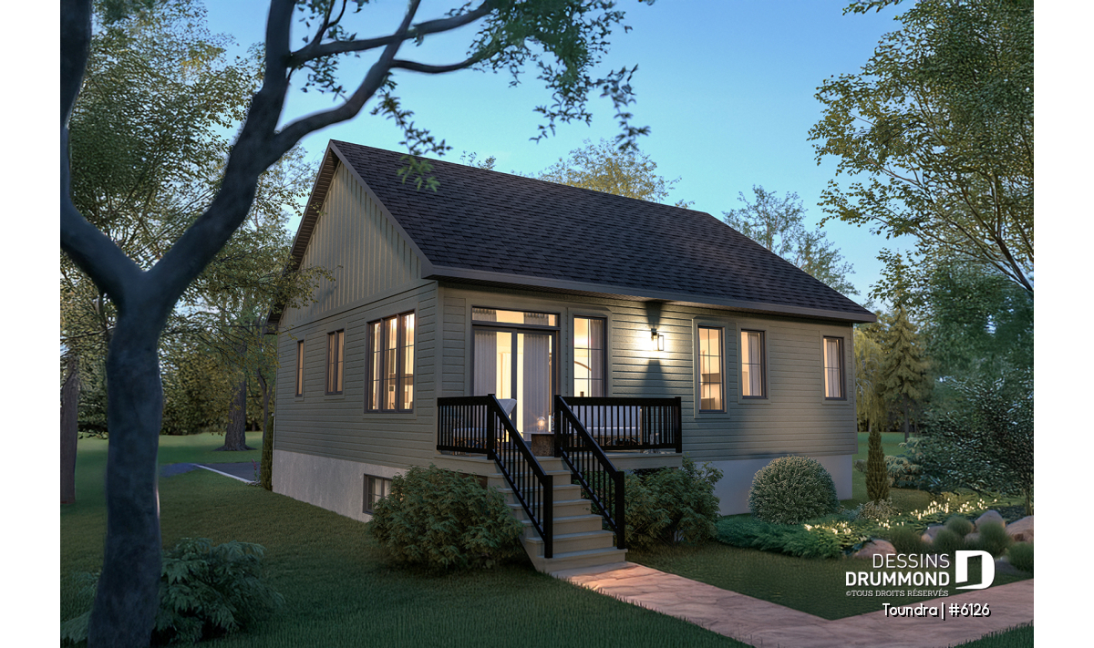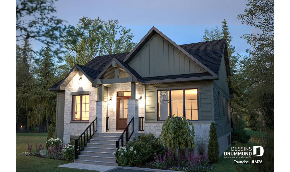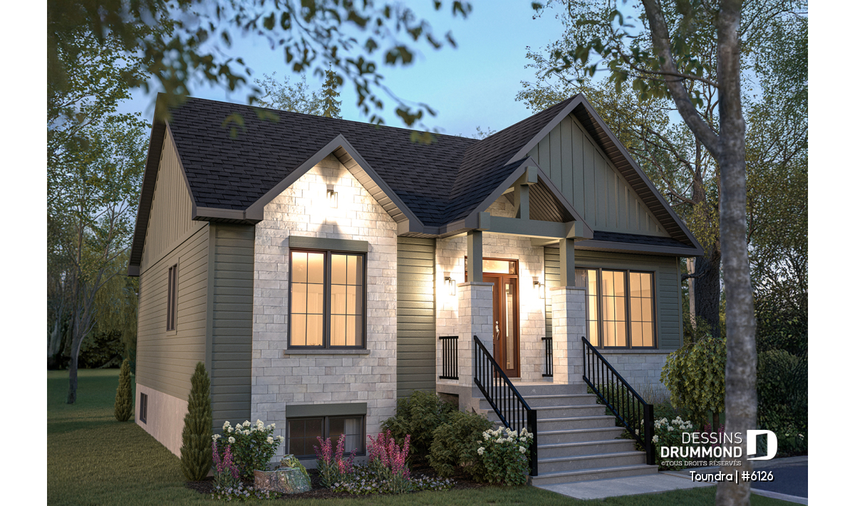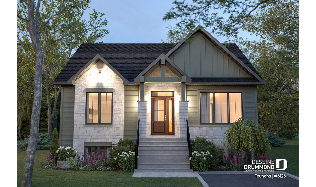 Vue avant - MODÈLE DE BASE - Plan de maison plain-pied, 2 à 4 chambres, aire ouverte, vestiaire et sous-sol aménagé (optionnel $) - Toundra