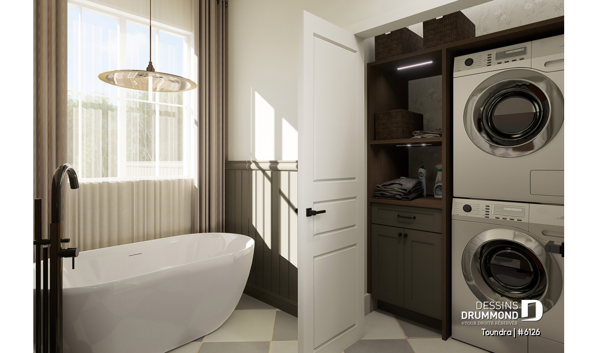 La salle de bain spacieuse a tout pour plaire : bain autoportant pour les moments de détente, douche indépendante vitrée, double lavabo et un coin laveuse/sécheuse superposées, ingénieusement intégré pour un maximum d’efficacité.