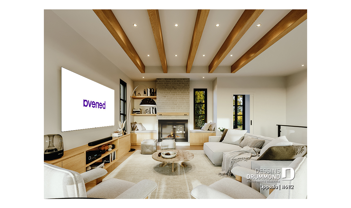 Plafond à 9' sur tout le rez-de-chaussée sauf au salon où il est à plus de 10'. Noter que le coût des poutres aménagées au salon n'est pas inclus dans notre estimation de coût de construction pour ce modèle.