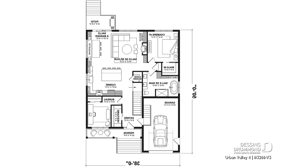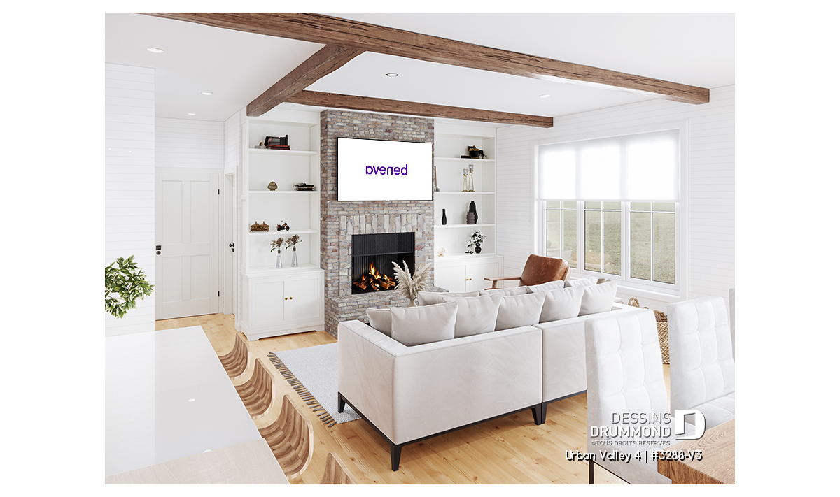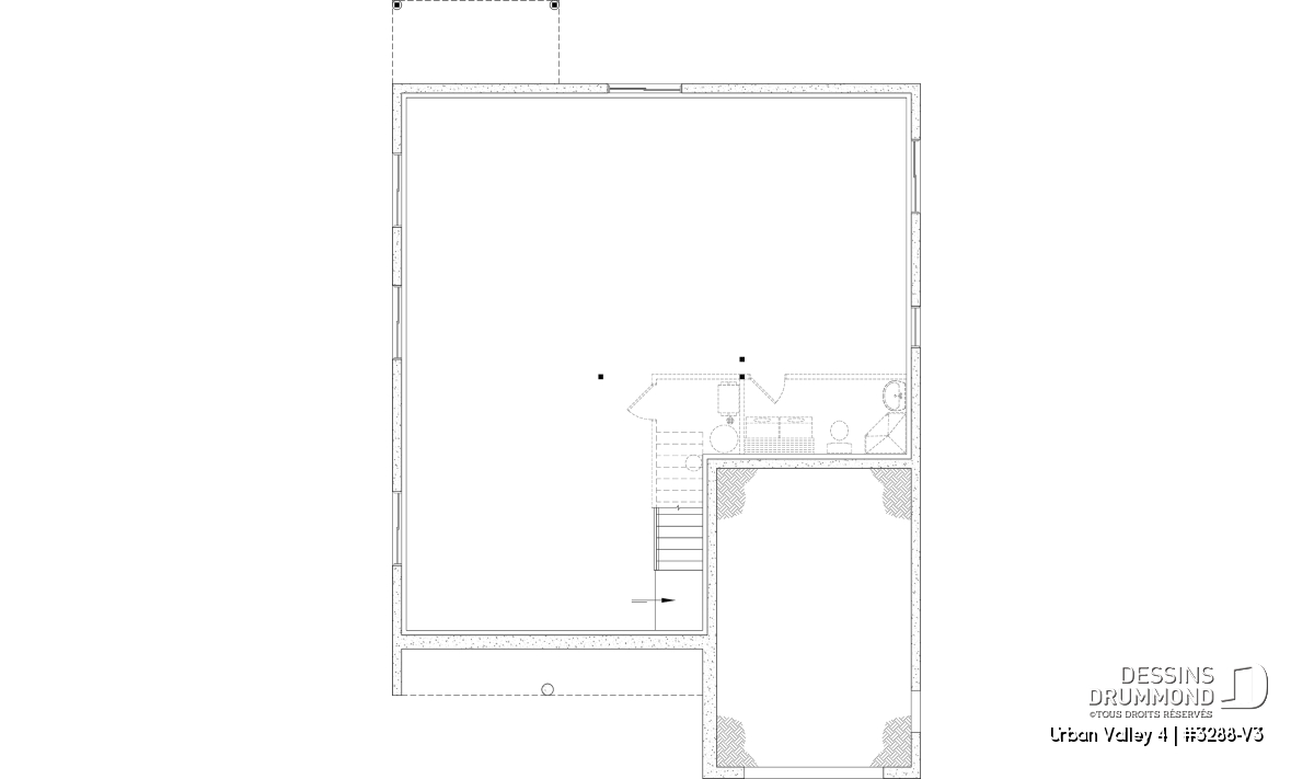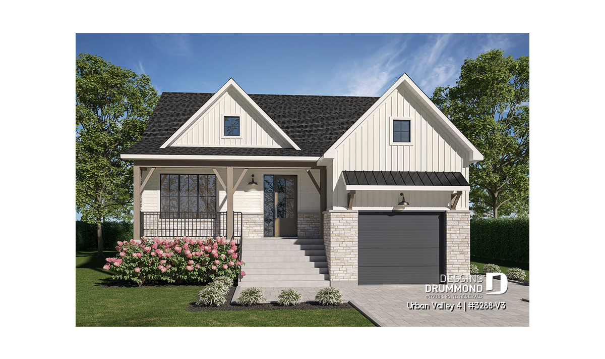 Le plan de maison Urban Valley 4 (#3288-V3) propose 1339 pi.ca. au rez-de-chaussée, et la même chose au sous-sol qui est entièrement aménagé (optionnel $). Ce plain-pied de style farmhouse inclut un total de 1 à 6 chambres et 2 salles de bain aménagés sur 2 étages. Tous les plafonds du plancher principal sont à 9’ de hauteur. Un garage simple et attaché est également proposé avec ce modèle.
