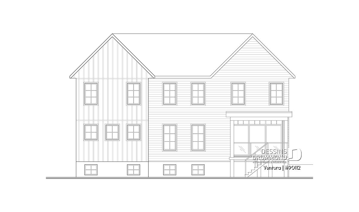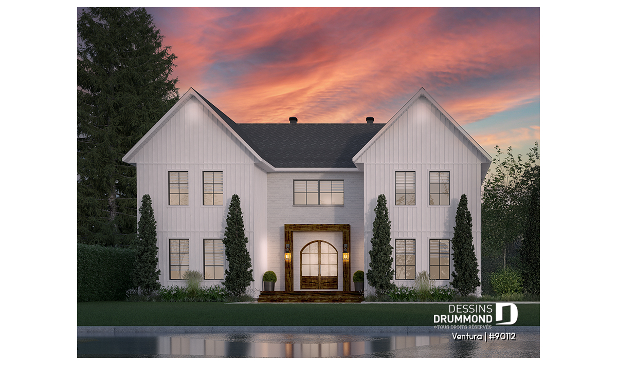 La conception de la maison Ventura (#90112) a été pensée pour un terrain ayant une façade nord-ouest. Dès l’approche vers le seuil avant, vous serez impressionnés par l’effet de grandeur qu’offre cette magnifique Farmhouse éco-responsable. Même pour les familles nombreuses, il sera impossible de se marcher sur les pieds dans cette noble demeure.
