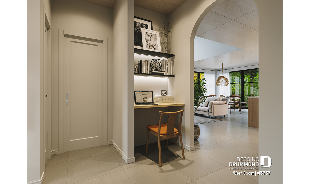L’entrée accueillante s’ouvre sur un vaste vestiaire pratique, idéal pour organiser manteaux et accessoires, et donne accès directement au garage. Cet espace comprend un coin salle mécanique, parfait pour ranger outils et équipements de jardinage et autres. À proximité, une salle d’eau et un coin bureau sont judicieusement situés en retrait des aires de vie, offrant intimité et tranquillité pour le télétravail.