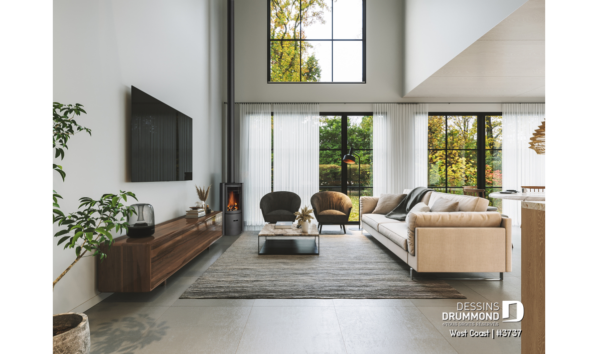 La cuisine, véritable cœur de la maison, est dotée d’un grand îlot rassembleur et d’un garde-manger fonctionnel. Elle s’ouvre sur une salle à manger lumineuse qui donne sur la cour latérale, créant un espace propice aux repas en famille et aux réceptions entre amis. Le salon, quant à lui, impressionne par son plafond spectaculaire de plus de 18’4’’ visible de la mezzanine à l’étage. C’est dans ce vaste espace que trône le poêle à bois STÛV modèle s30C, prévu près du téléviseur, apportant chaleur et ambiance scandinave tout au long des saisons froides.
