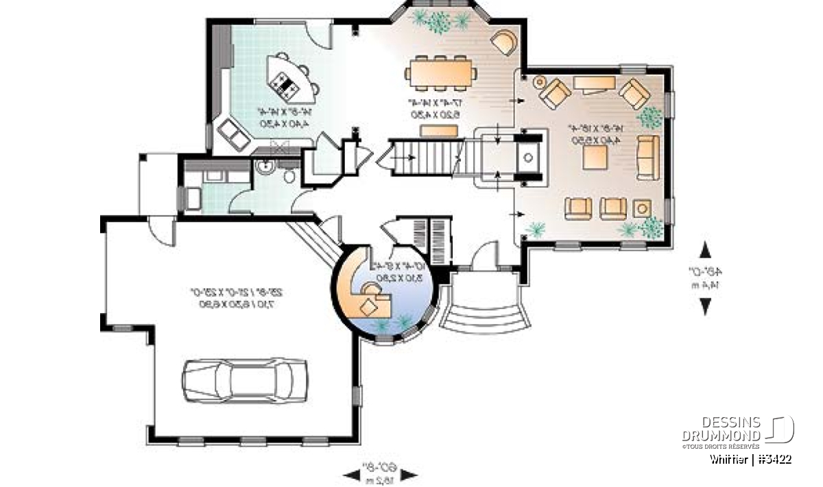 À l’intérieur, on est d’abord accueilli dans un espace entrée original car ouvert partiellement sur une salle de séjour pittoresque, au plafond à douze pieds, partageant un foyer mitoyen avec un palier d’escalier assurant l’accès tant à cette entrée qu’à la salle à manger. Cette dernière, à l’arrière, se veut des plus confortables et bien éclairée avec une large fenêtre en baie. On remarque aussi, sur l’arrière, une cuisine attrayante avec un assez grand garde-manger, un îlot lunch central et une triple porte jardin. Attenant à celle-ci, on retrouve un coin toilette ainsi qu’une buanderie. La tourelle suggère pour sa part un espace bureau aussi original.
