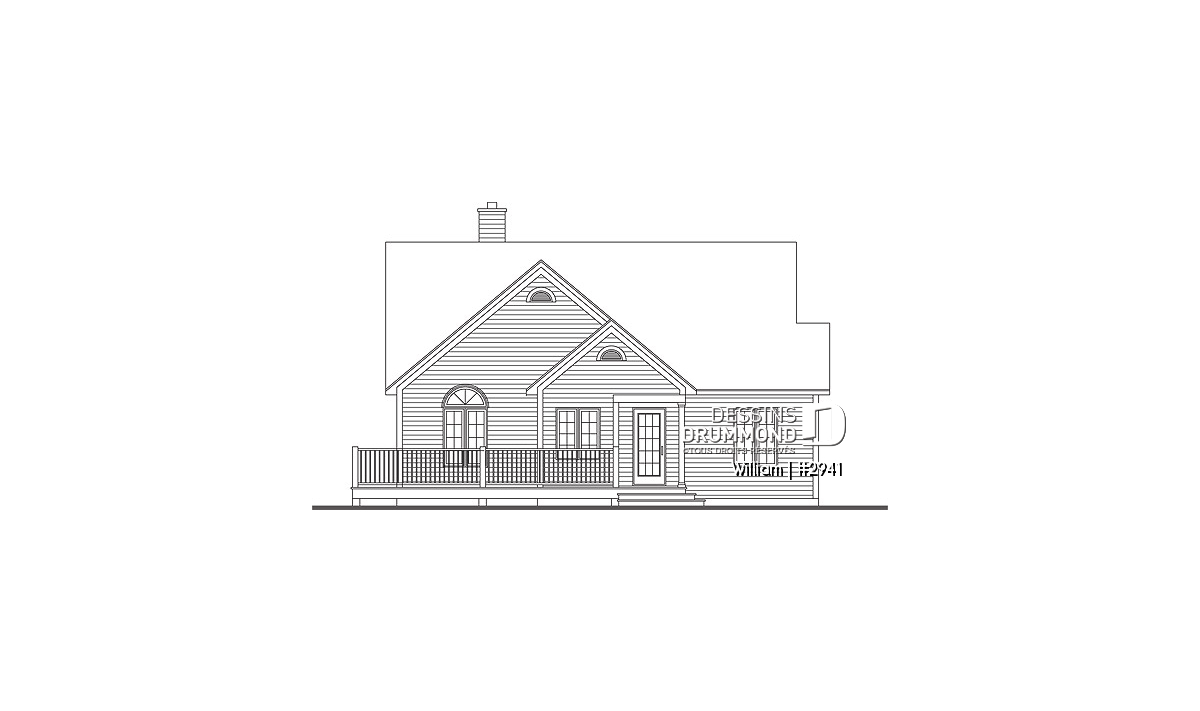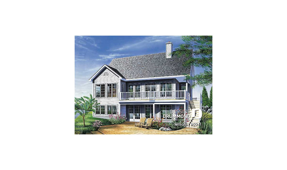 Vue arrière - MODÈLE DE BASE - Plan de maison genre chalet avec plafond cathédrale, suite des maîtres, grande terrasse, sous-sol à aménager - William
