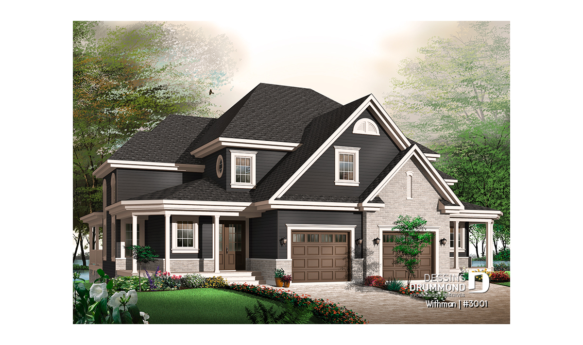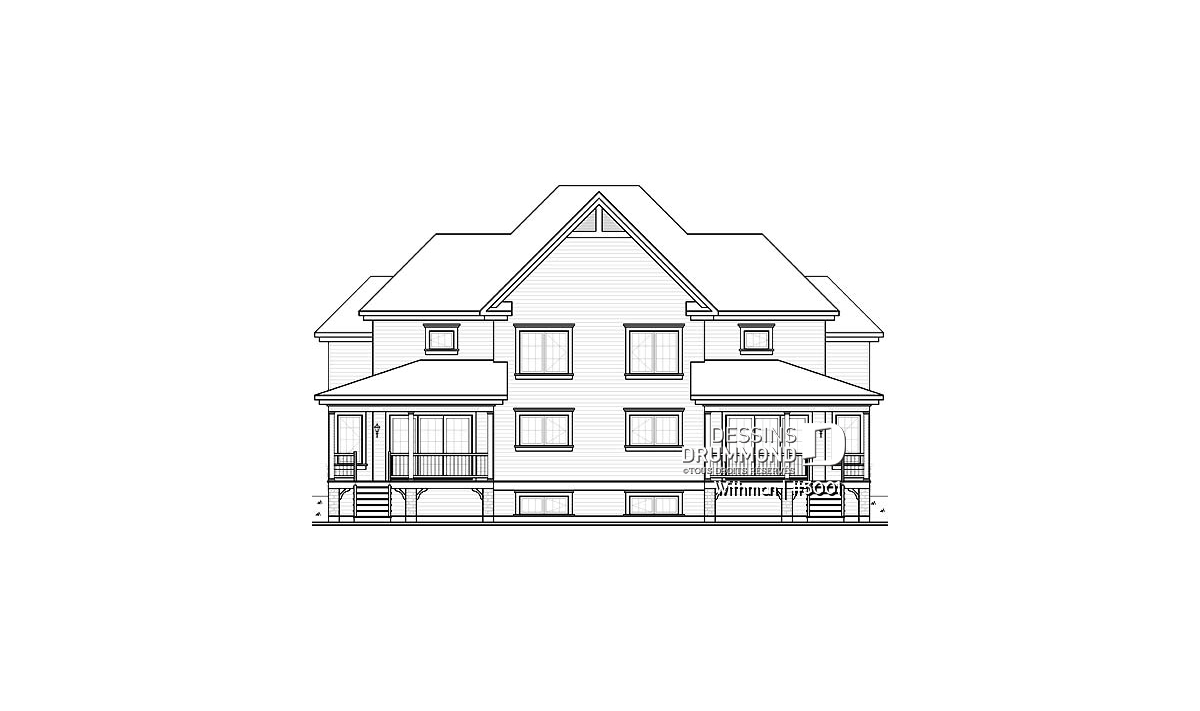 Vue avant - MODÈLE DE BASE - Plan de duplex avec 2 garages, 3 chambres et 2 salles de bain par logement, belle cuisine avec garde-manger - Withman