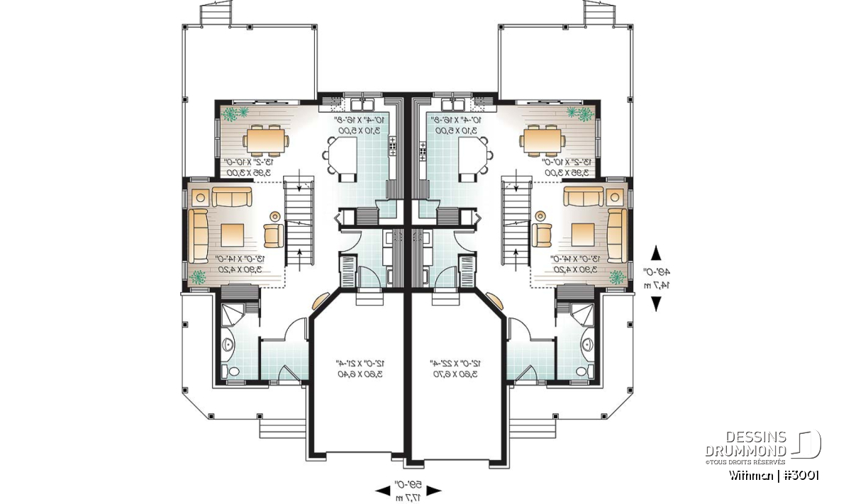 Plan de duplex avec 2 garages, 3 chambres et 2 salles de bain par logement, belle cuisine avec garde-manger