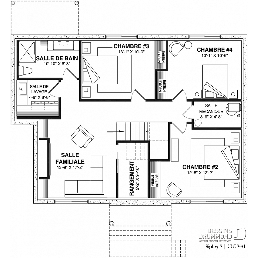 Le plan de maison Ripley 2 (3152-V1) propose 1204 pi.ca. aménagés sur chacun des planchers. Il s'agit en fait d'une version réaménagée et agrandie du plan d'origine Ripley (3152-BH) qui n'offrait que 2 chambres versus 4 pour celui-ci, si vous optez pour le sous-sol aménagé (optionnel $).