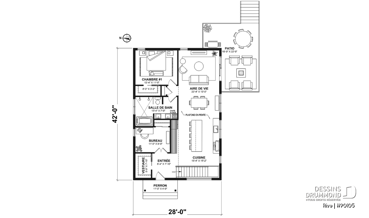 Le plan de la maison RIVE (#90105) a été conçu pour n’avoir aucun corridor et donc aucune perte d’espace! Chaque pied carré de Rive a été optimisé et une fonction lui a été attribuée.