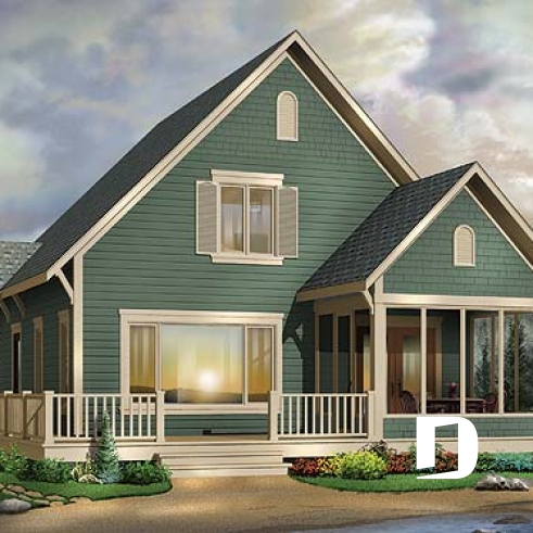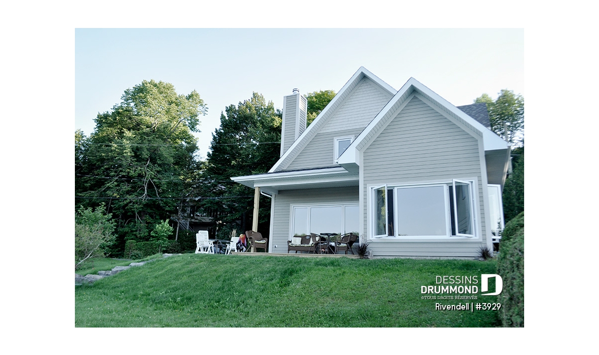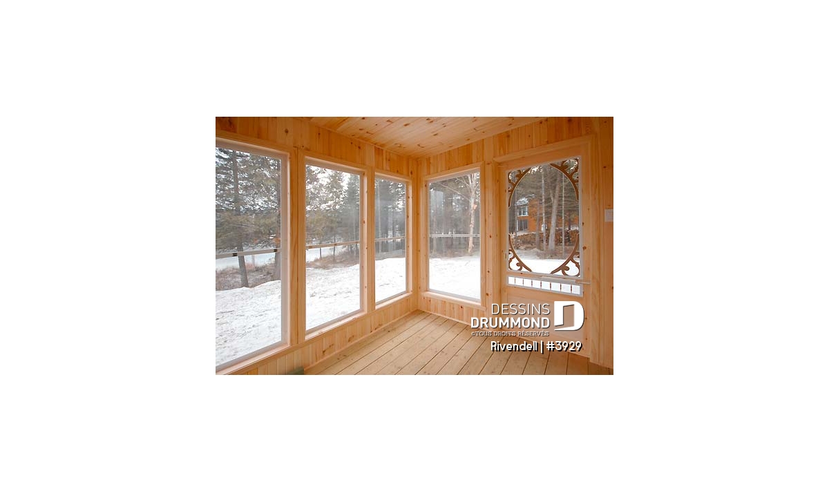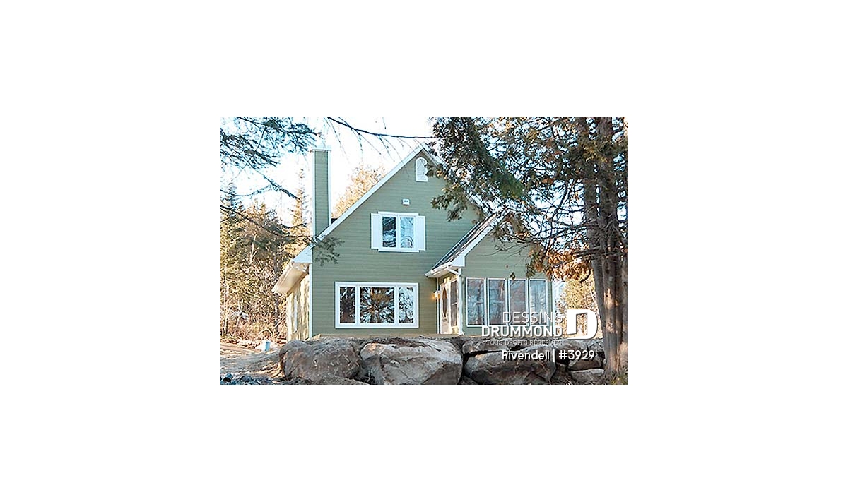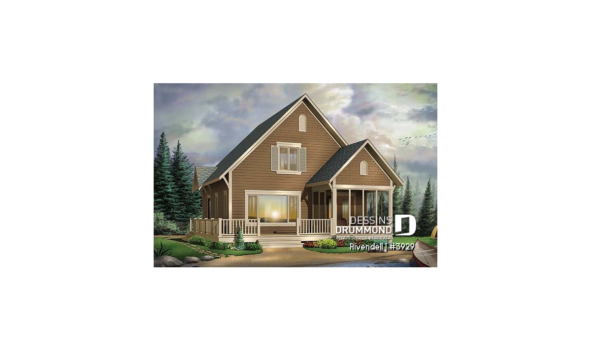 Vue avant - MODÈLE DE BASE - Plan de petit chalet (ski), rangement ski à l'entrée, 3 chambres, abri moustiquaire, îlot, 2 salles de bain - Rivendell