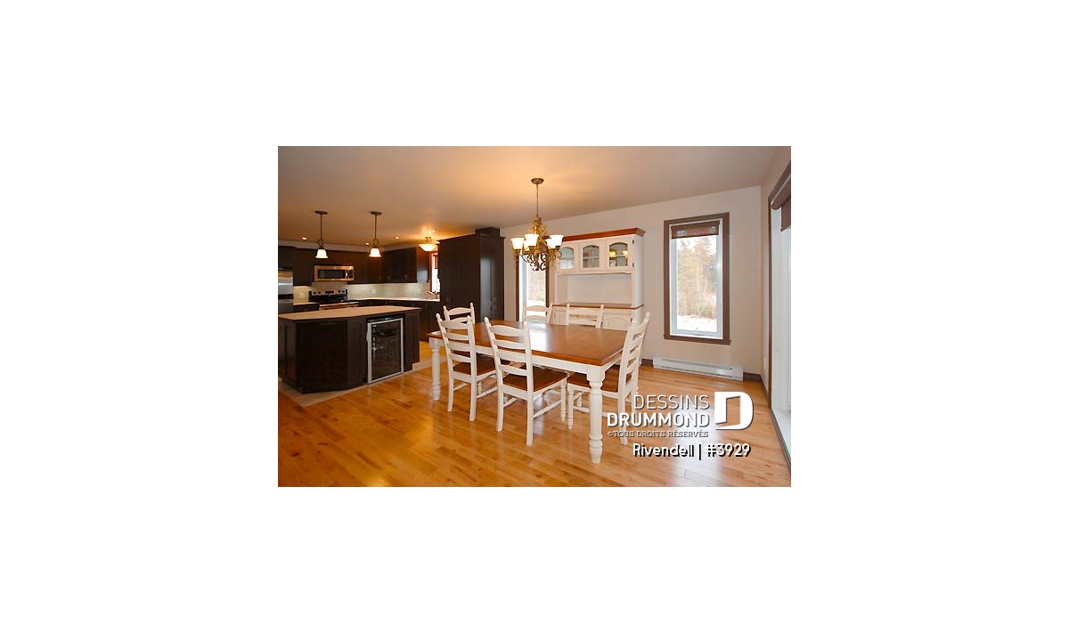D’abord, nous voilà dans un vestibule de bonne grandeur et agrémenté d’une garde-robe d’entrée de type « walk-in » et comme il se doit pour une habitation du genre. Ensuite, nous voici dans le secteur activités entièrement ouvert et abondamment fenêtré qui nous donne le réel sentiment de partager notre habitat avec la nature extérieur. Ici, un îlot-lunch central à la cuisine s’avère un élément clé de cette communion avec la nature en permettant aux cuisiniers de bien voisiner le décor et non de lui tourner le dos.