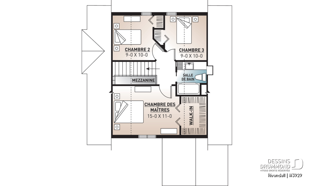 Étage - Plan de petit chalet (ski), rangement ski à l'entrée, 3 chambres, abri moustiquaire, îlot, 2 salles de bain - Rivendell