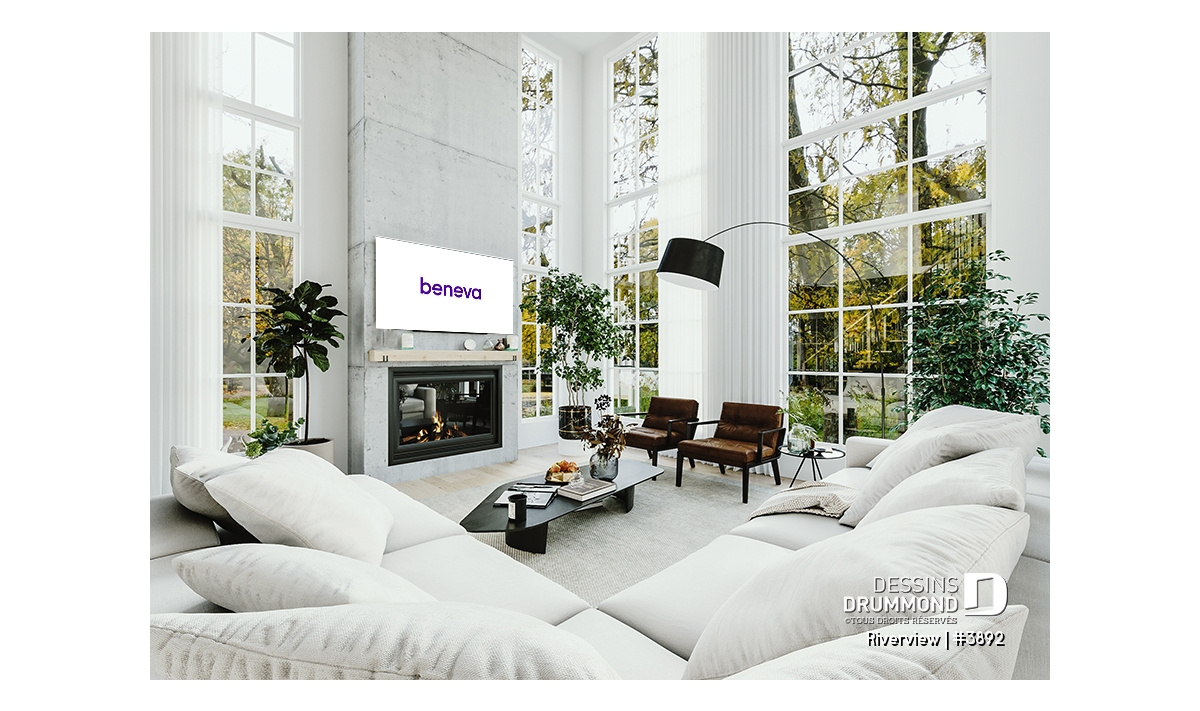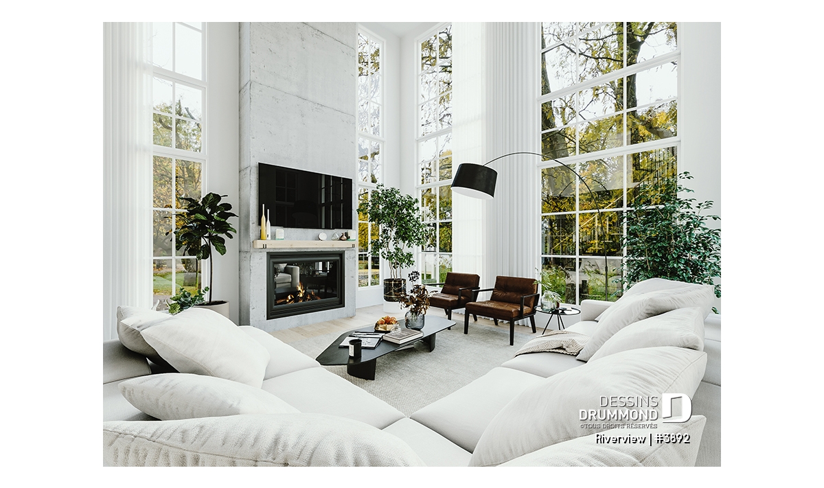 Salle de séjour spectaculaire, baignée de lumière naturelle, avec plafond de 18 pi 6 po et foyer chaleureux.