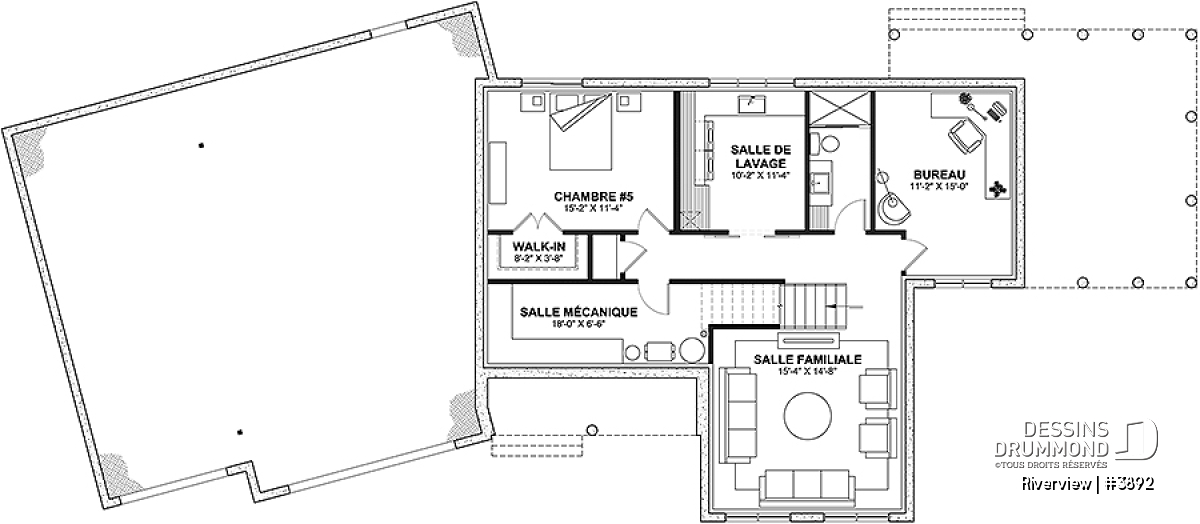 *Si vous souhaitez acheter le plan du sous-sol aménagé, tel que présenté sur la page de ce plan, veuillez sélectionner cette option dans le panier d'achat, dans la section "Sélectionner votre fondation". Si vous ne sélectionnez pas cette option, vous recevrez le sous-sol non fini, sans frais additionnel.