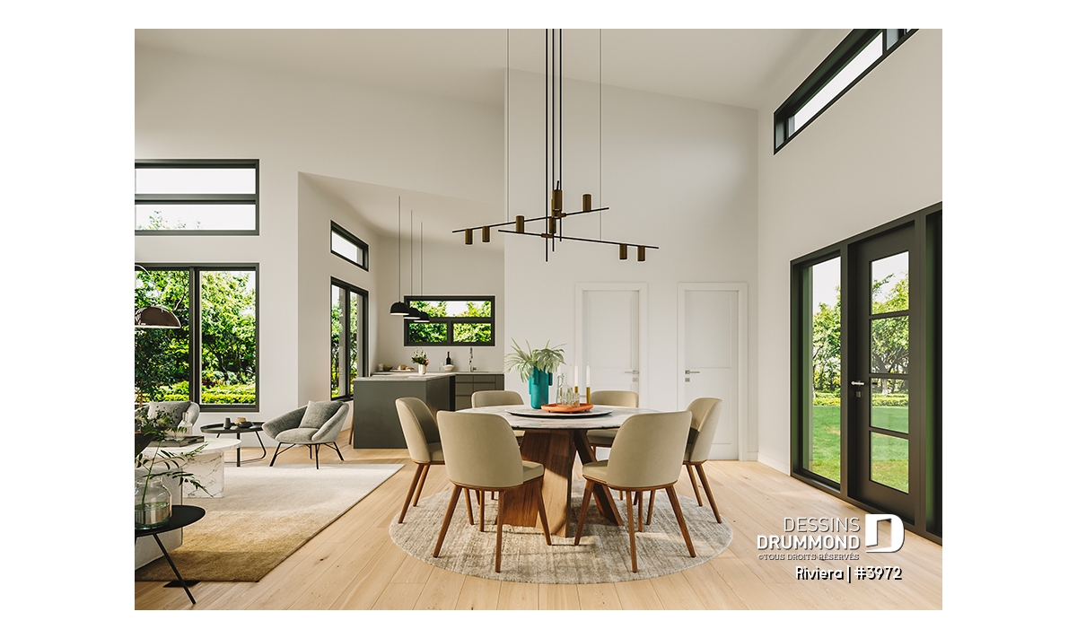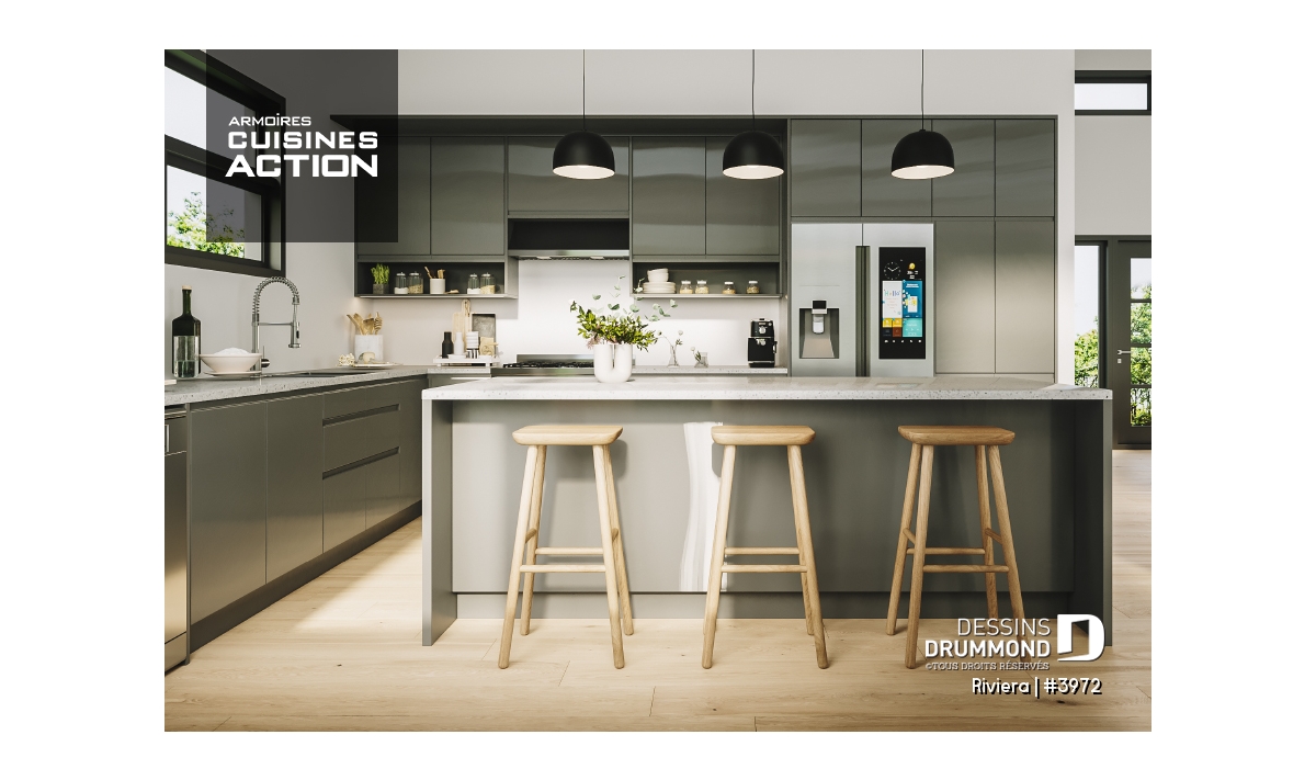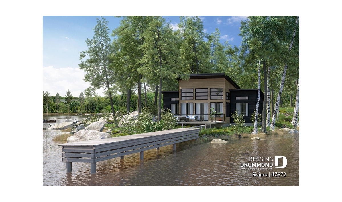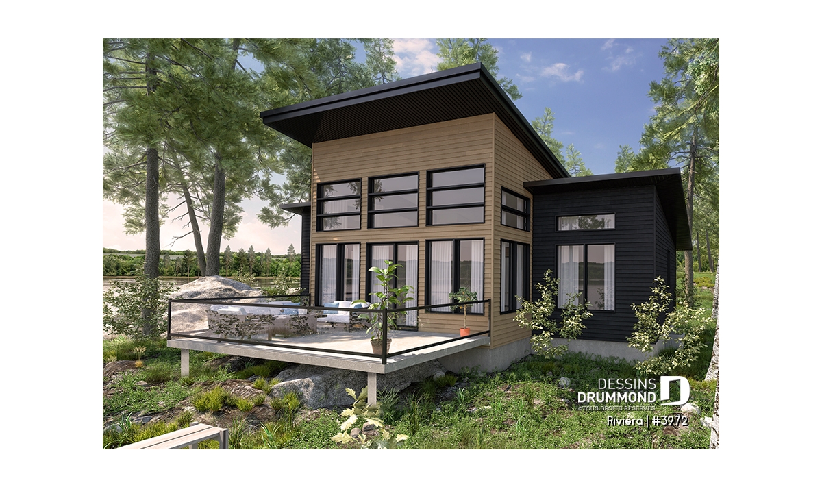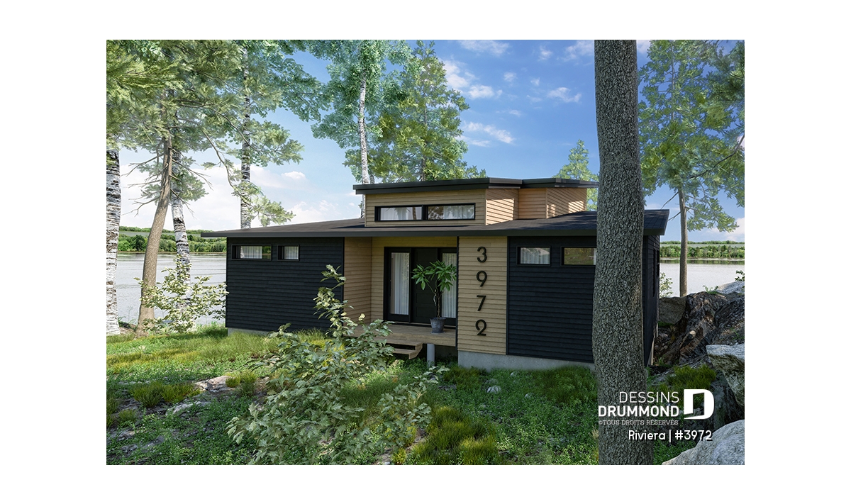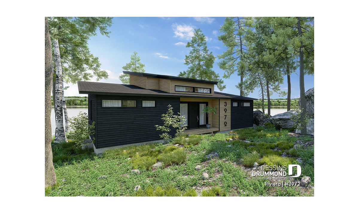 Le plan de maison RIVIERA (plan #3972) de style contemporain propose 1209 pieds carrés de surface aménagée au rez-de-chaussée, et la même superficie au sous-sol qui est non-fini.