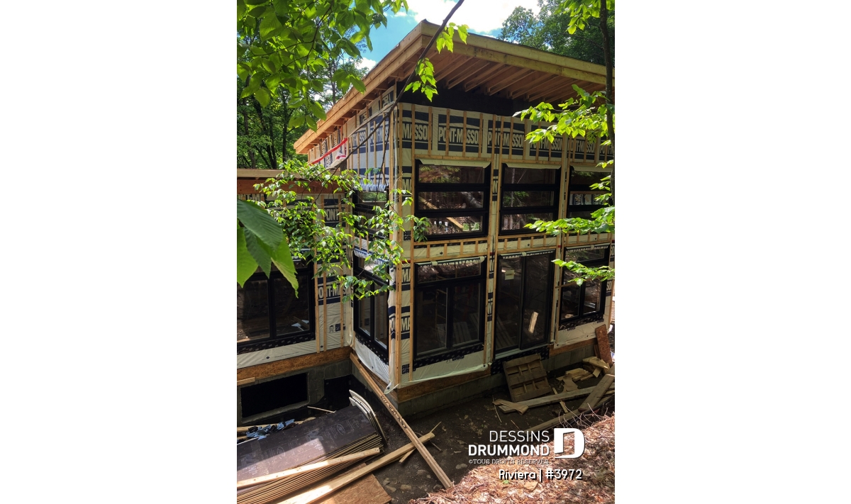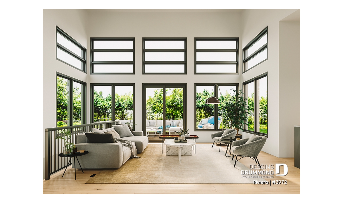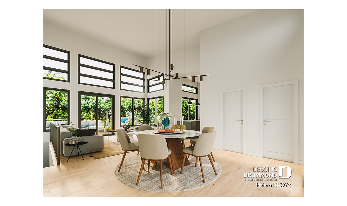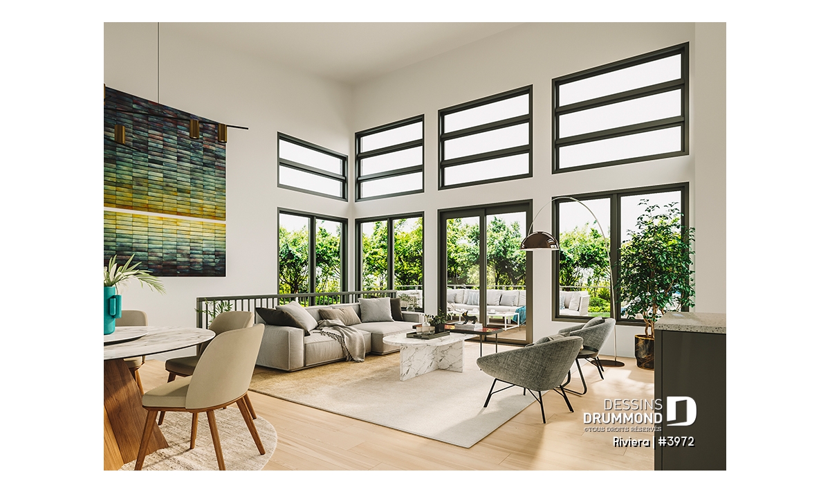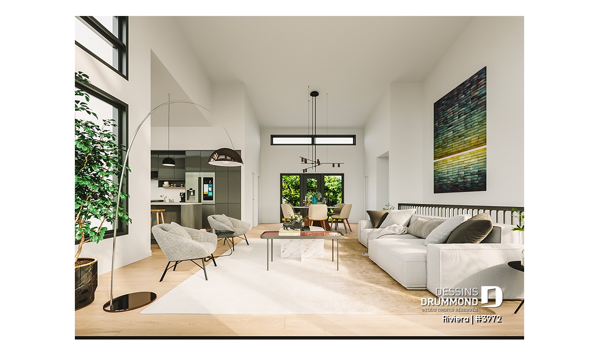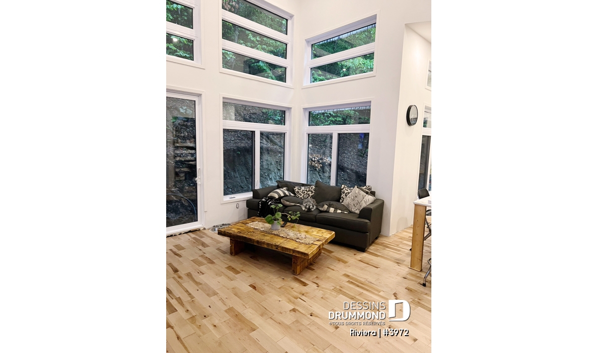 Le plan de maison RIVIERA (plan #3972) de style contemporain propose 1209 pieds carrés de surface aménagée au rez-de-chaussée, et la même superficie au sous-sol qui est non-fini.